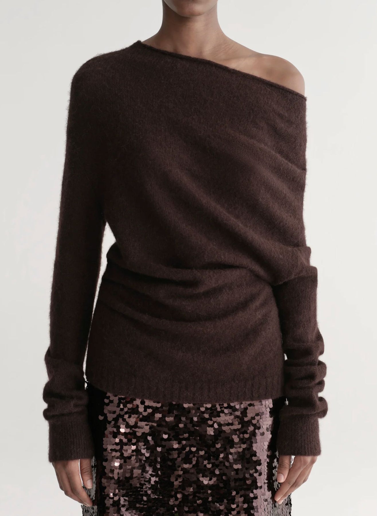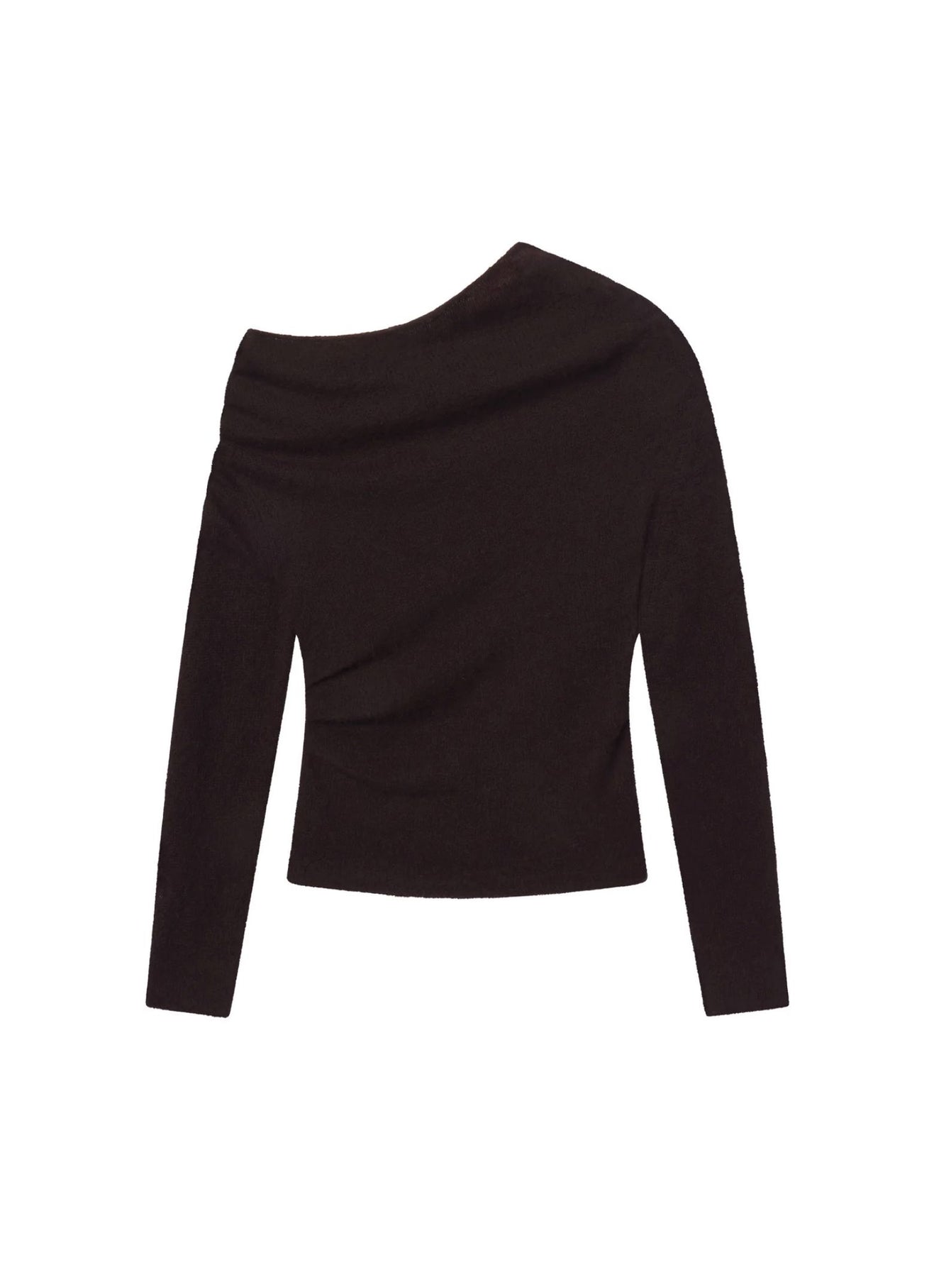 The Freya Top is a modern, sculptural take on the off-the-shoulder sweater. Crafted in a soft alpaca and Merino wool blend in a deep plum hue, this lightweight brushed knit feels cozy yet refined. The asymmetric off-the-shoulder silhouette and long sleeves create subtle drama, while the drapey finish allows for effortless styling—perfect layered under a blazer, paired with tailored trousers, or worn with skirts for evening occasions.