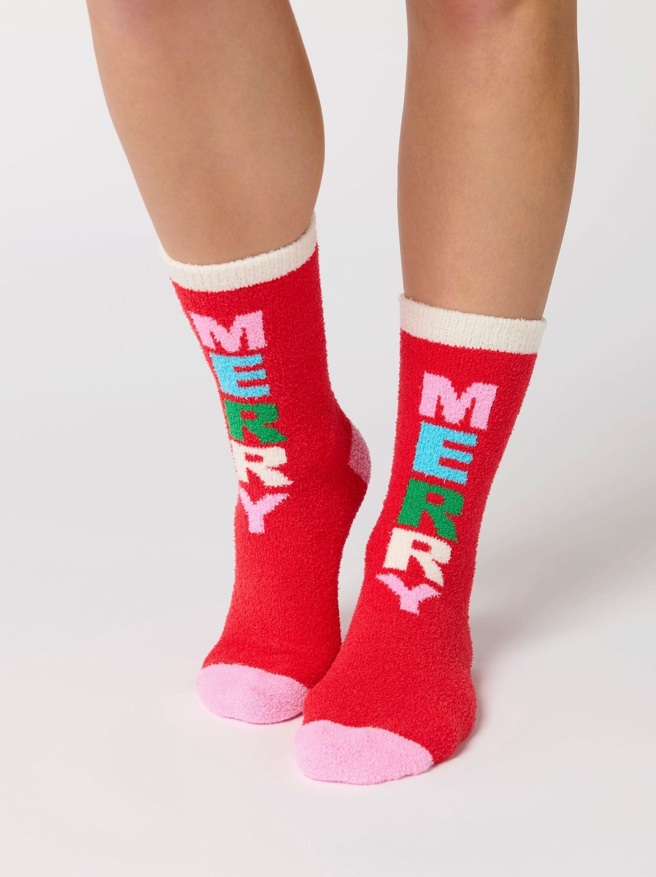 Fits size 5-10. Made from polyester and spandex, get ready to kick up some holiday cheer in our cozy “Merry” Socks! These bright red crew socks feature the word “Merry” spelled vertically in a rainbow of festive colors. Accented with soft pink toes and a creamy cuff, they’re a joyful blend of comfort and Christmas spirit. Made from a plush, fuzzy fabric, they’re perfect for lounging fireside, unwrapping gifts, or sipping cocoa in style.