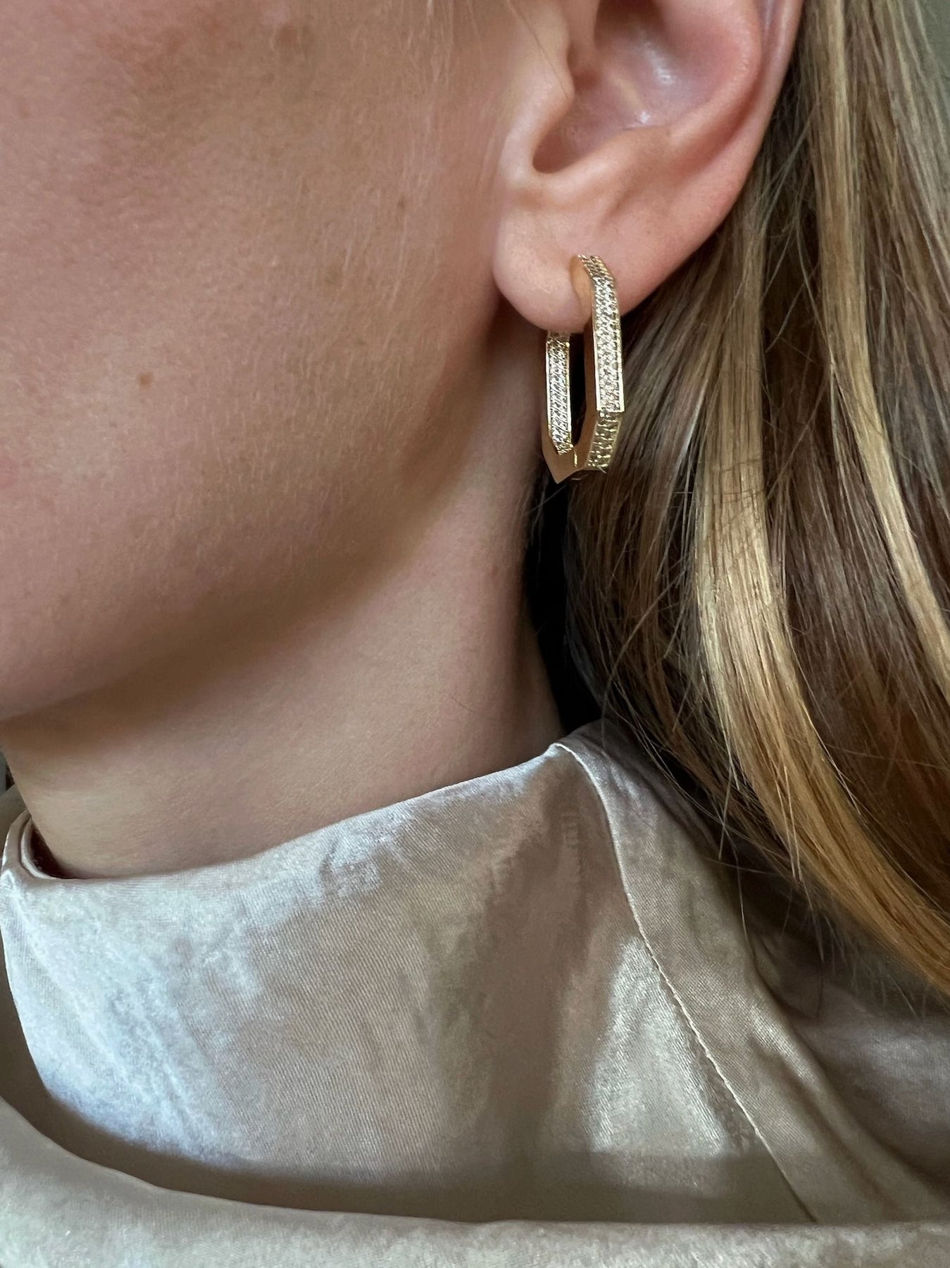 Sharp lines, strong angles—these octagonal hoops are made to stand out. Crafted in 14K gold plate and inlaid with clear CZs for a refined edge, they’re ultra-light and effortless for everyday wear. A bold, modern statement that catches the light and commands attention.