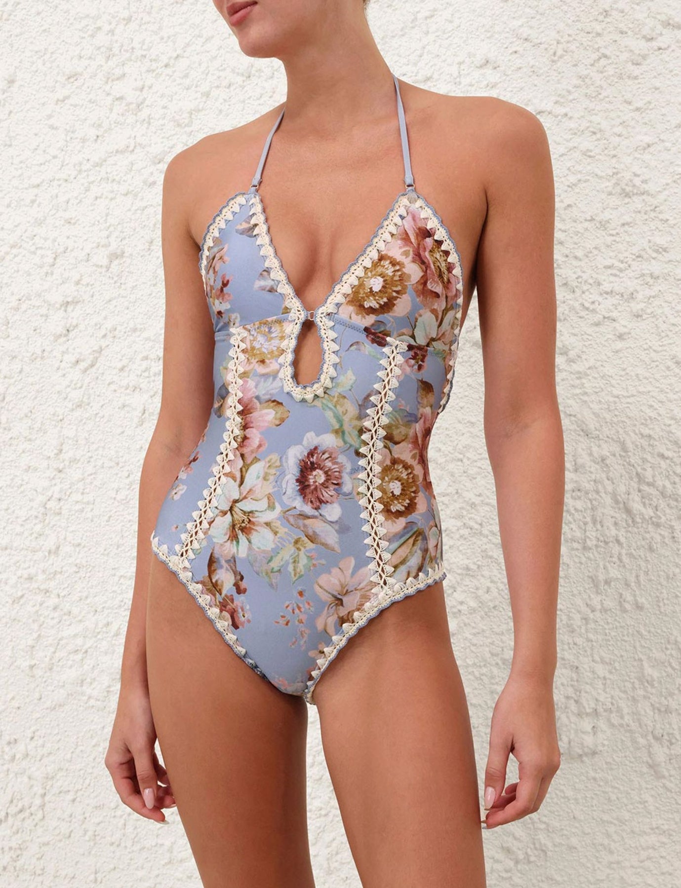 The Awaken Crochet Keyhole 1PC in Chambray Floral from our Resort Swim 2026 Collection. A shiny lycra one piece swimsuit featuring a keyhole detailing at the bust, self-tie neck and back straps with toggle ends and crochet trim throughout.