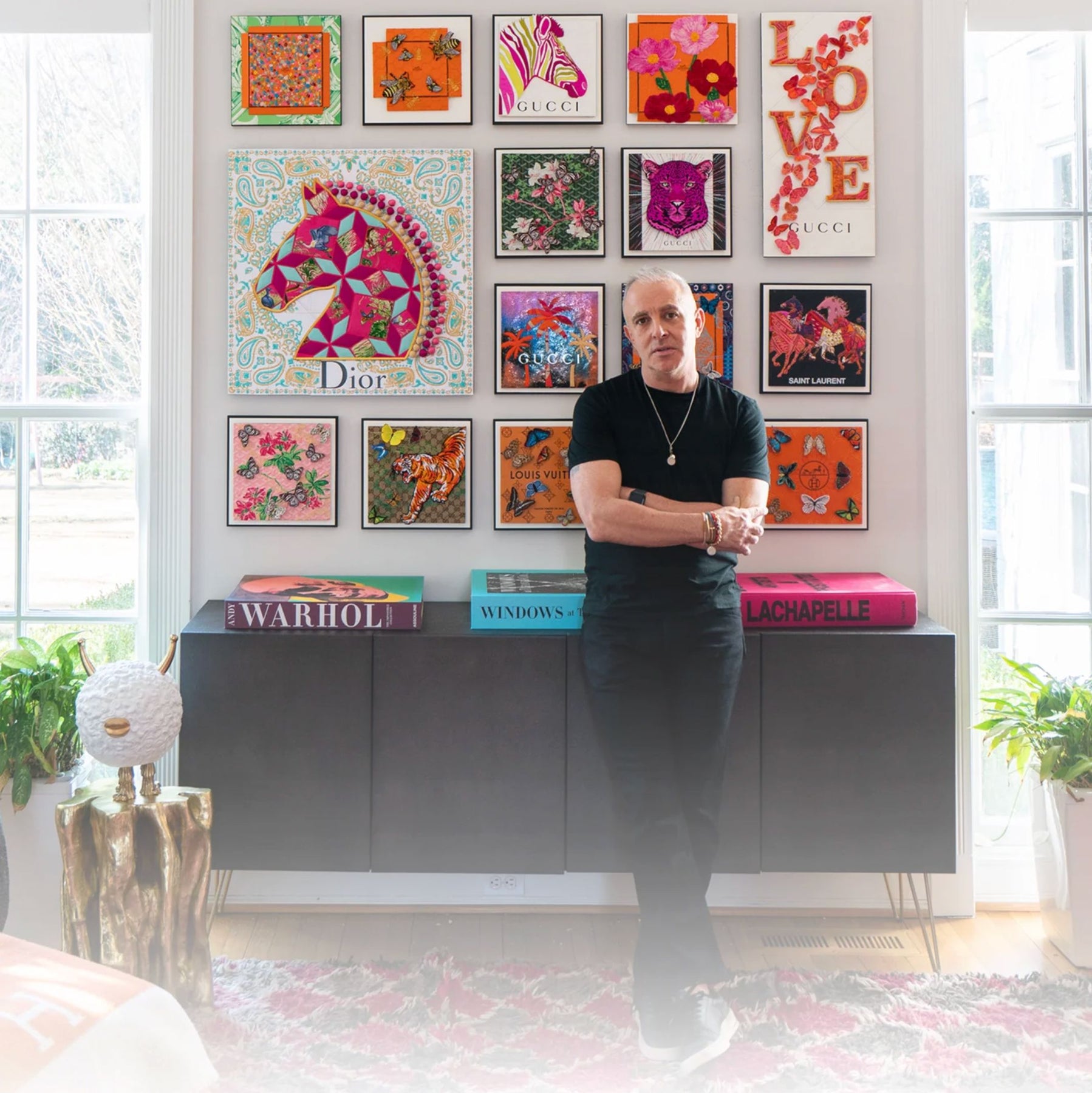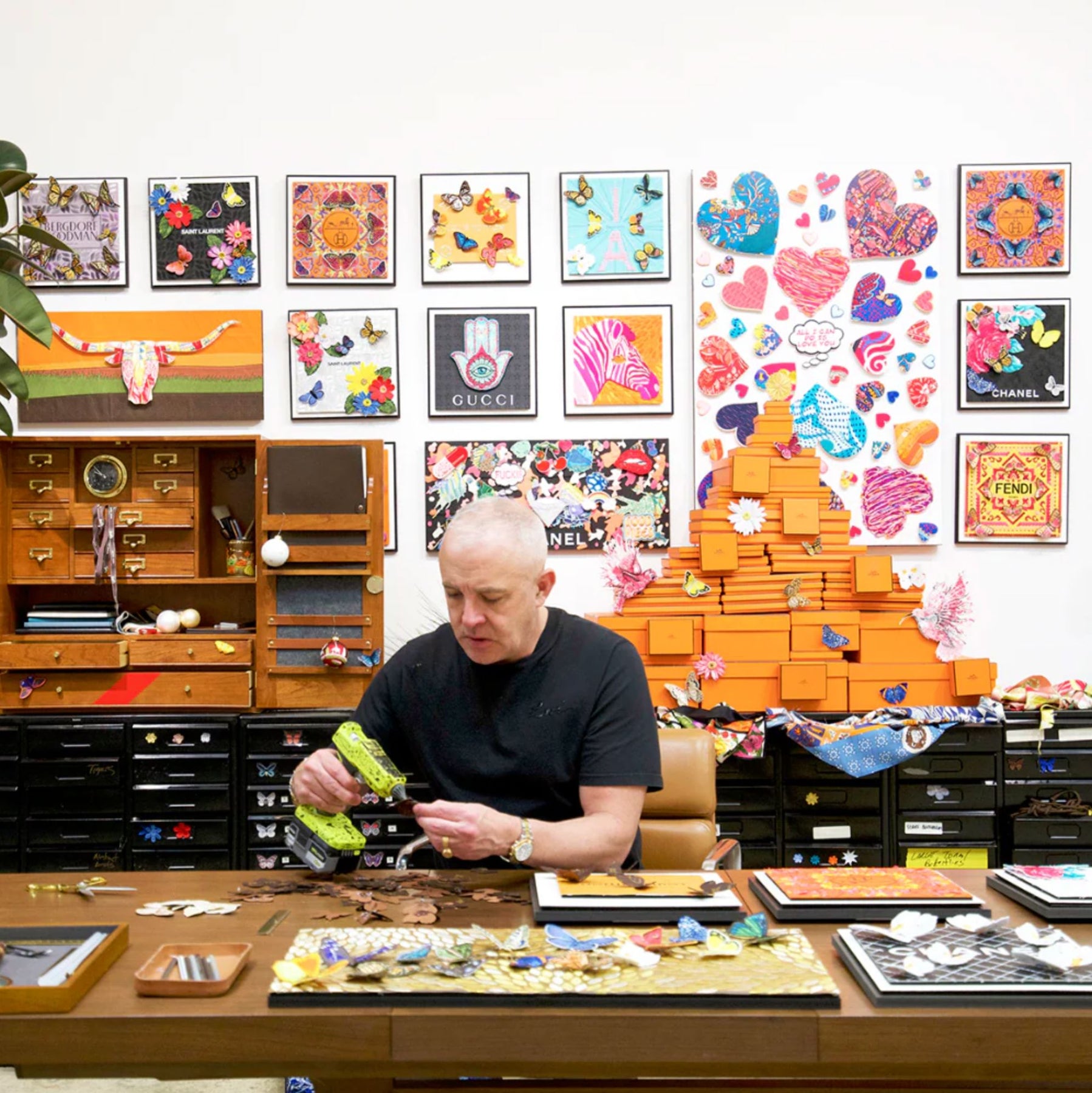 The petite swarms are a signature piece at the studio. They start with up-cycled luxury boxes or shopping bags that are trimmed into the background shape, collaged and then embroidered. The embroidery is stitched directly through the actual box itself. Each petite features intricate embroidery stitches that truly make each one unique. When the background is complete it is padded and mounted. The butterflies are all embroidered as well and are hand trimmed in Stephen Wilson's studio. Each butterfly is mounted in relief on the background for a truly unique, dimensional piece of artwork. The Butterfly Swarm petites would make the perfect gift for any art or fashion lover.