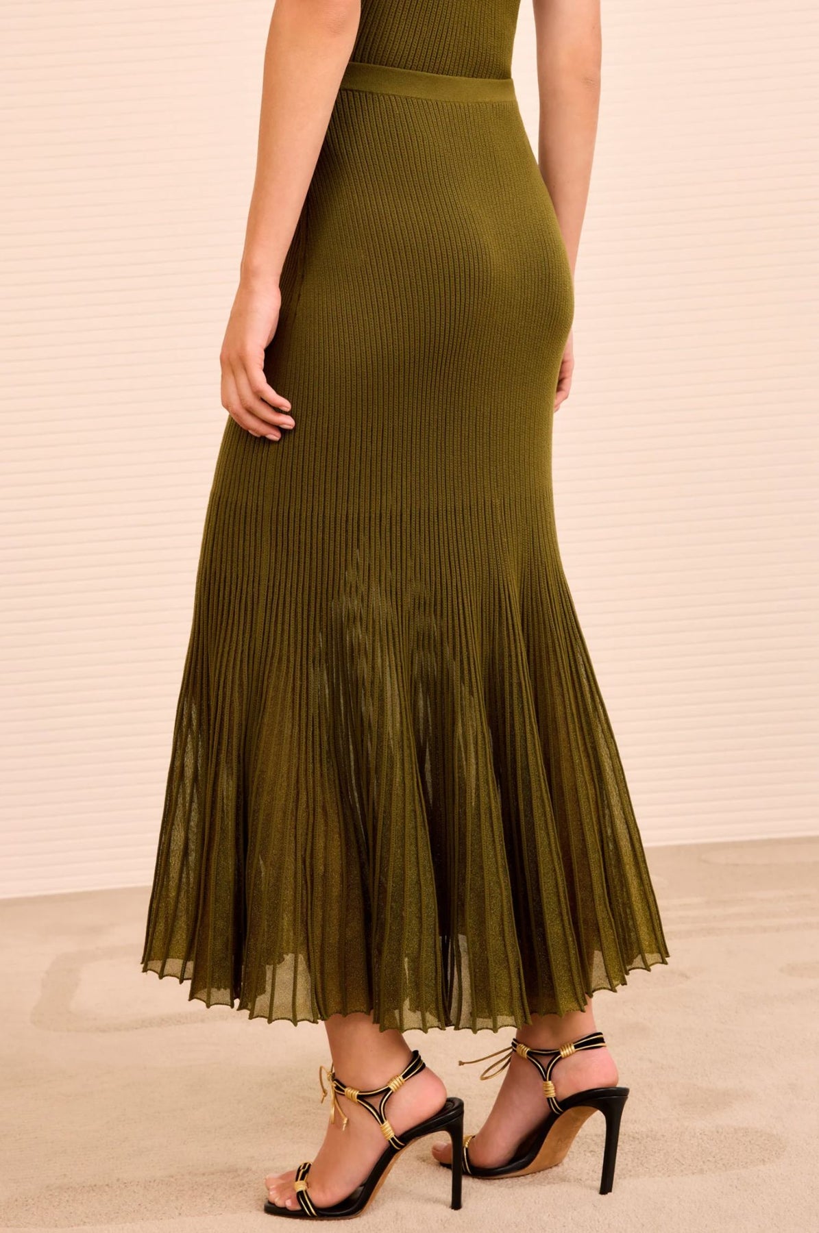 Designed with a pleated flared hem, the Vera Skirt lends poetic movement at every step. It is spun from signature sunburst knit in lush green with lurex yarns that glimmer throughout.