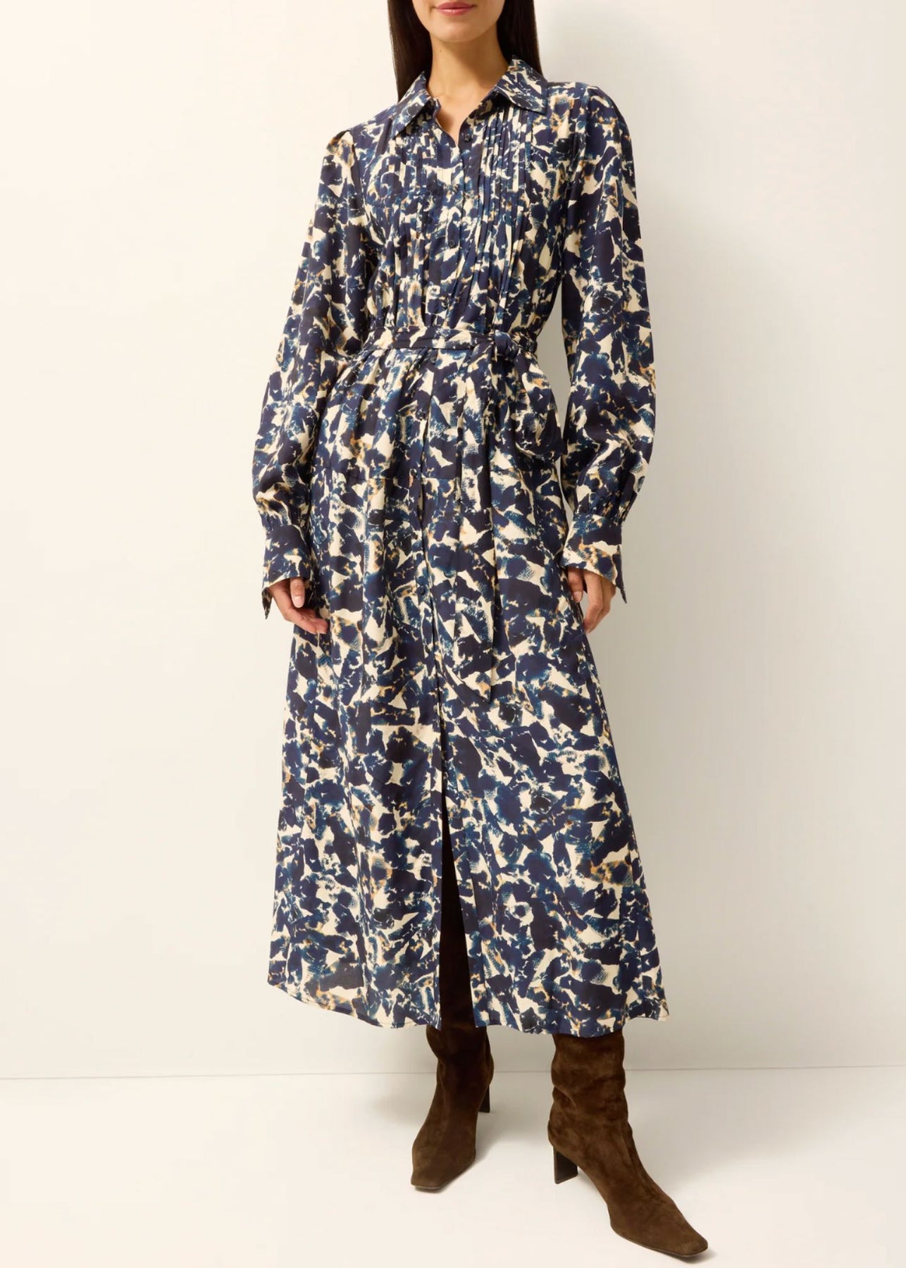 The sophistication of a classic shirt dress makes it a year-round staple, carrying you from office hours to evening plans with ease. This long-sleeve version features pintuck pleats along the bodice and an optional tie belt for versatile styling. Cut in our new Pyrite print, a bespeckled mineral motif.