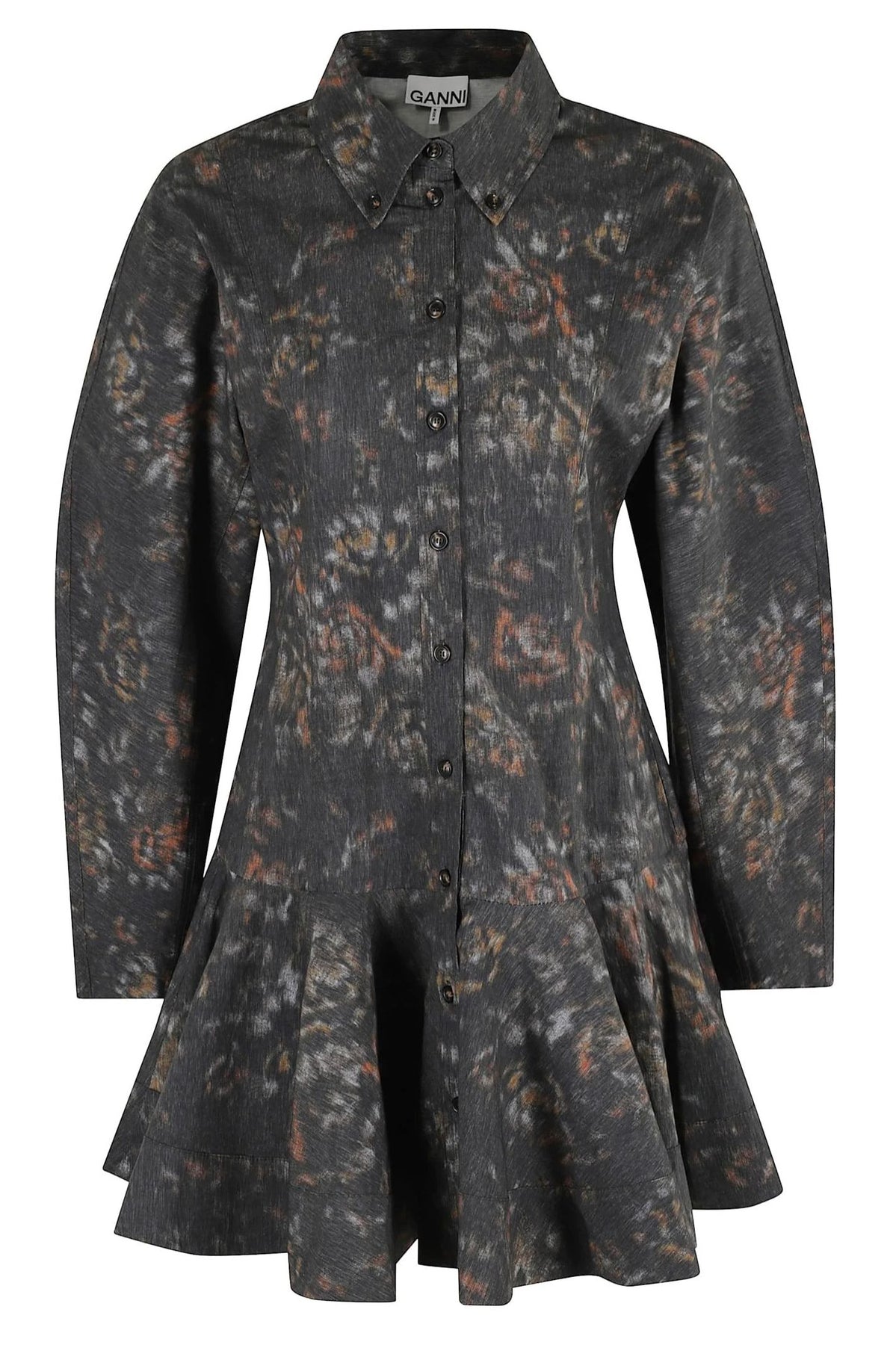 This dress features a washed floral print, classic collar, button-front closure, drop waist and ruffled hem detail.