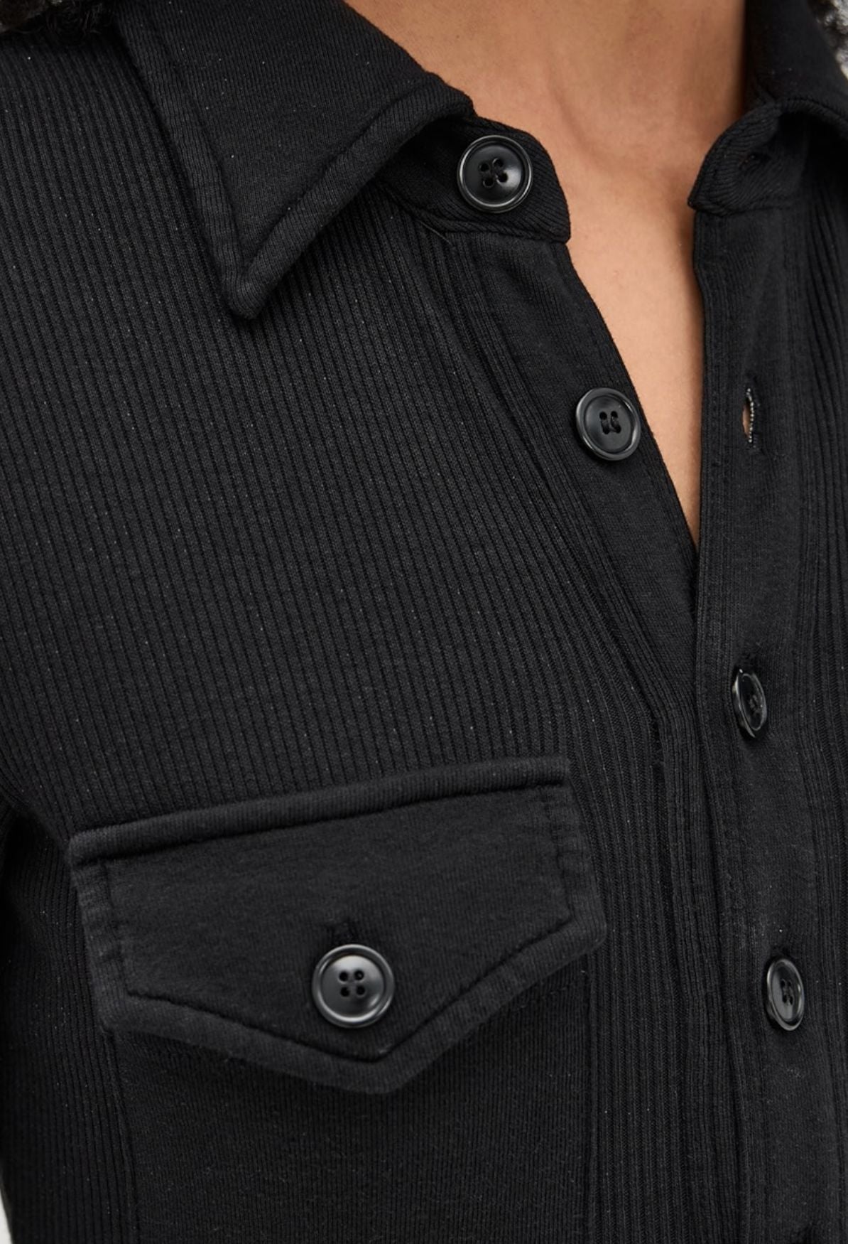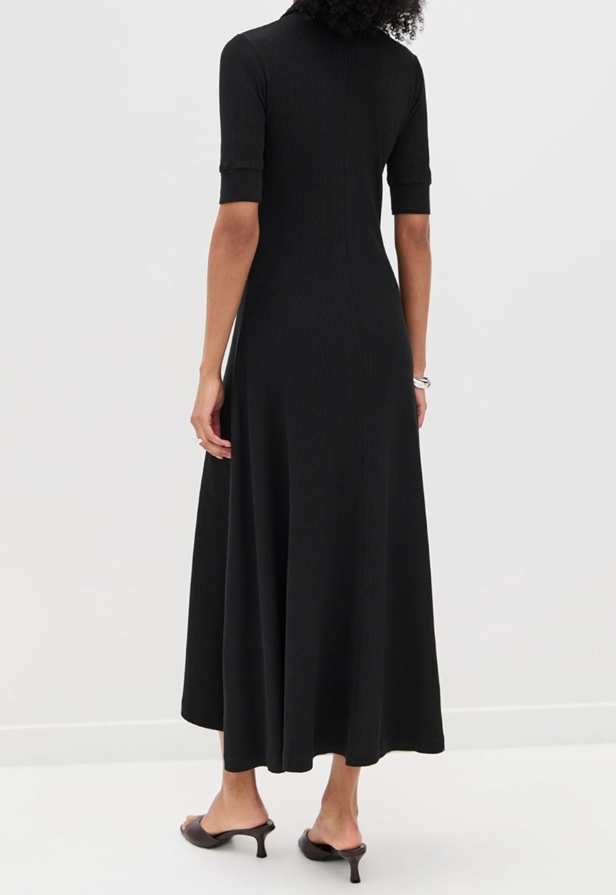 The ‘Amina’ dress is a modern take on the classic polo, cut in a softly structured rib with a button-down front and gently flared hem. Crafted from an ultra-soft, supportive blend of regenerative cotton and lyocell, it offers all-day comfort with a close fit through the bodice. In true black, it’s a polished essential—wear it solo with boots or layered over a slim turtleneck for cooler days.