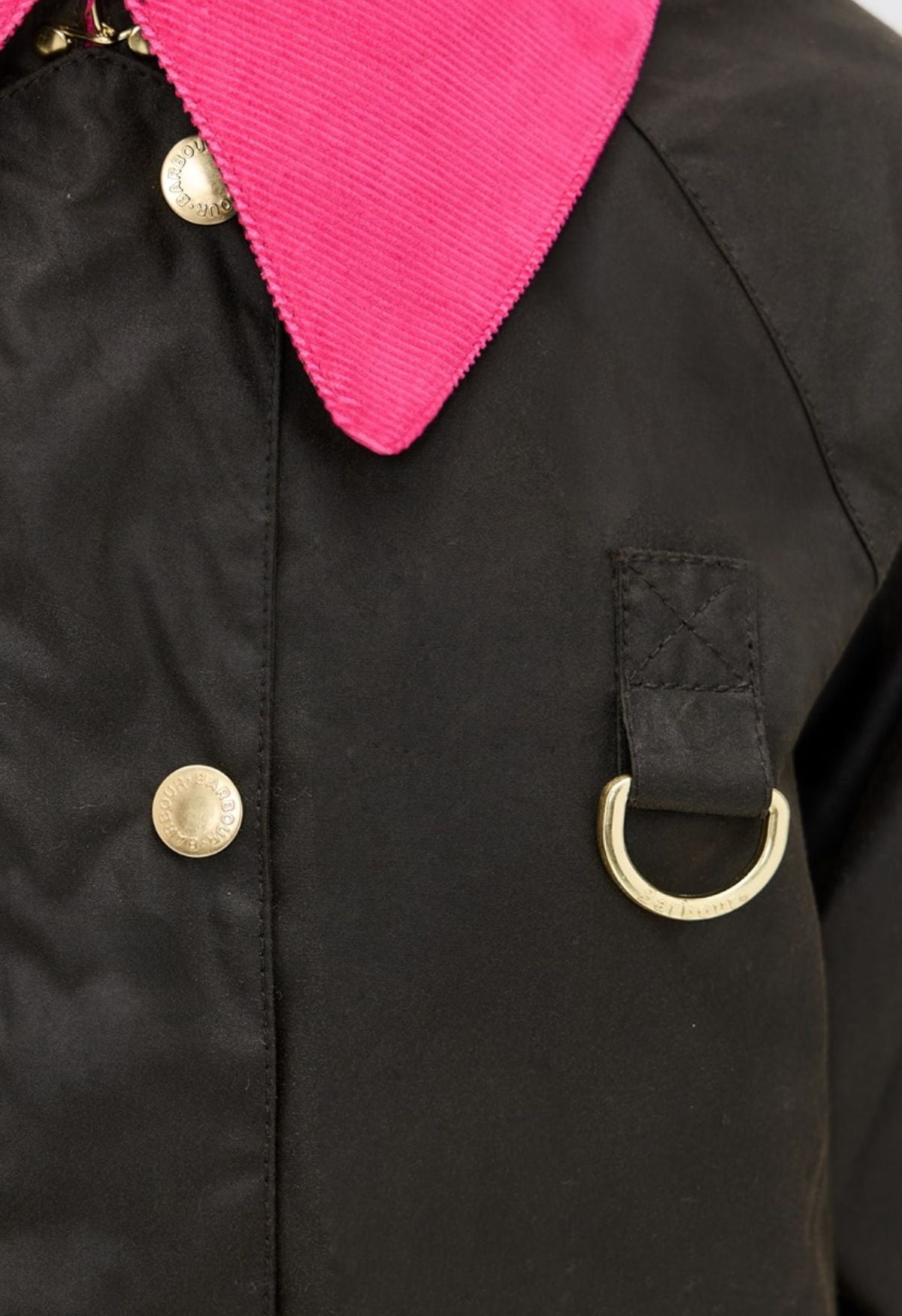 The Barbour Icons Waxed Cotton Jacket is a short, Spey-inspired style featuring a contrast corduroy collar and cuffs, classic bellowed pockets with side entry, and signature D-ring detailing.