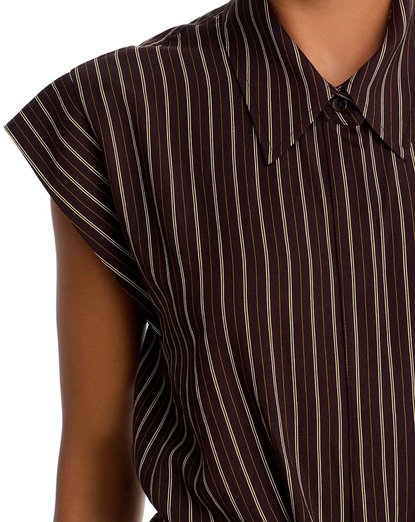 The Emilia Dress is crafted from barre stripe shirting in a ganache-brown palette, with soft drape and fluid movement that contours the body. This short-sleeve maxi silhouette features elegant wrap-tie detailing at the waist for a subtle cinch, sharp collar, and a clean concealed placket, offering a refined take on classic shirt dressing.