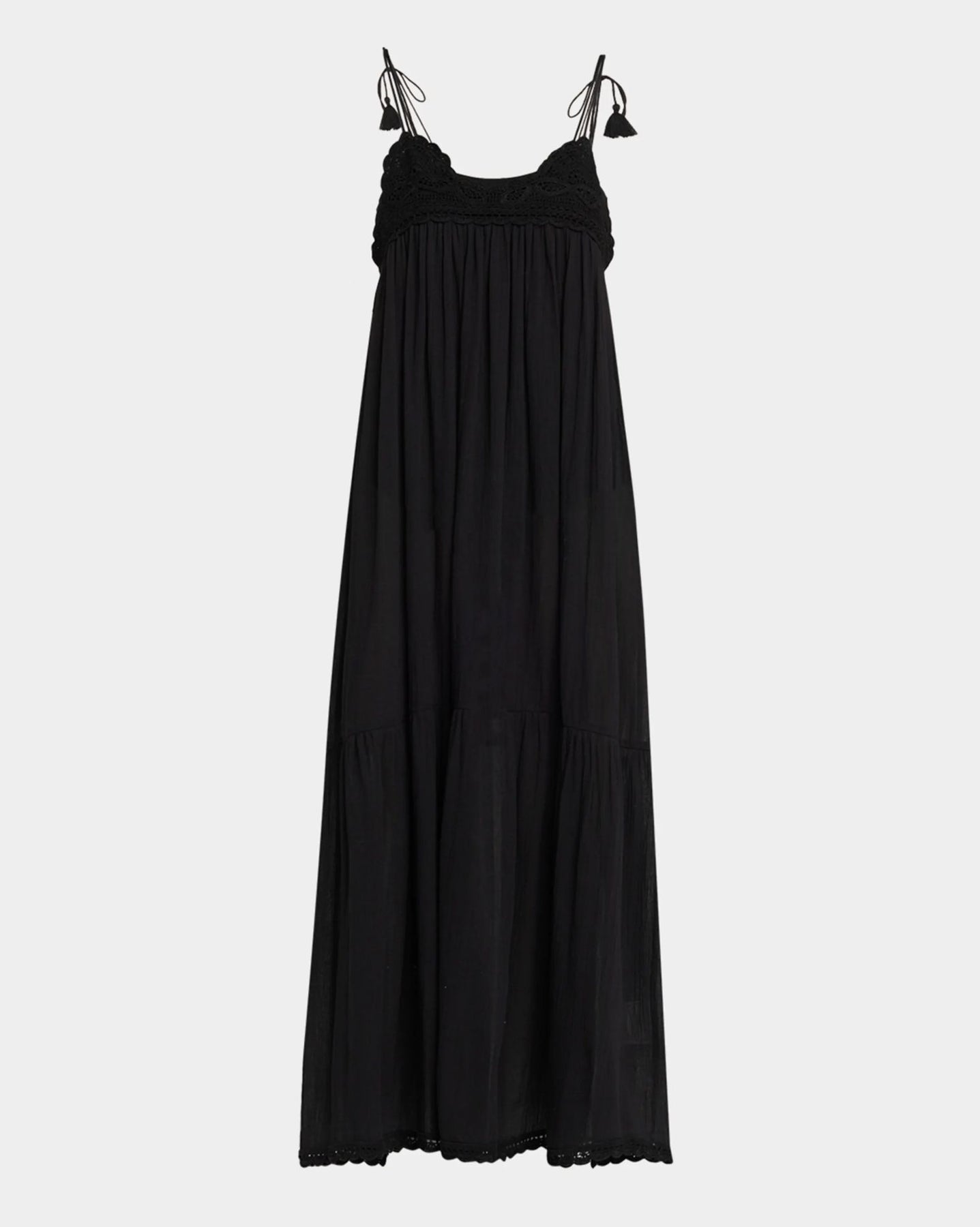 The Linnea Dress fuses the elegant ease of a coverup with artisanal details. Crafted from lightweight black gauze, it’s suspended from self-tie straps that meet intricately hand-crocheted florals before releasing to airy volume.