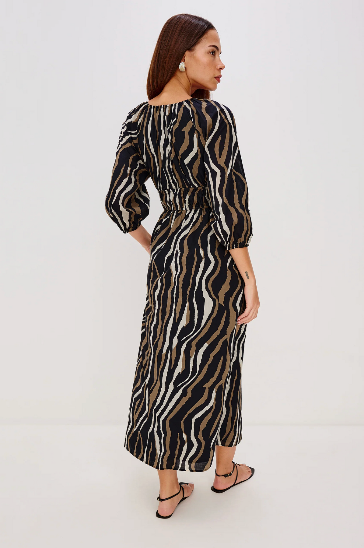 Flowy, feminine, and effortlessly breezy, the Paio maxi dress features a bold, abstract print in lightweight beach cotton. It has an elastic V-neckline, front keyhole cutout, defined waist and cuffs, billowing three-quarter sleeves, and a fully lined body.