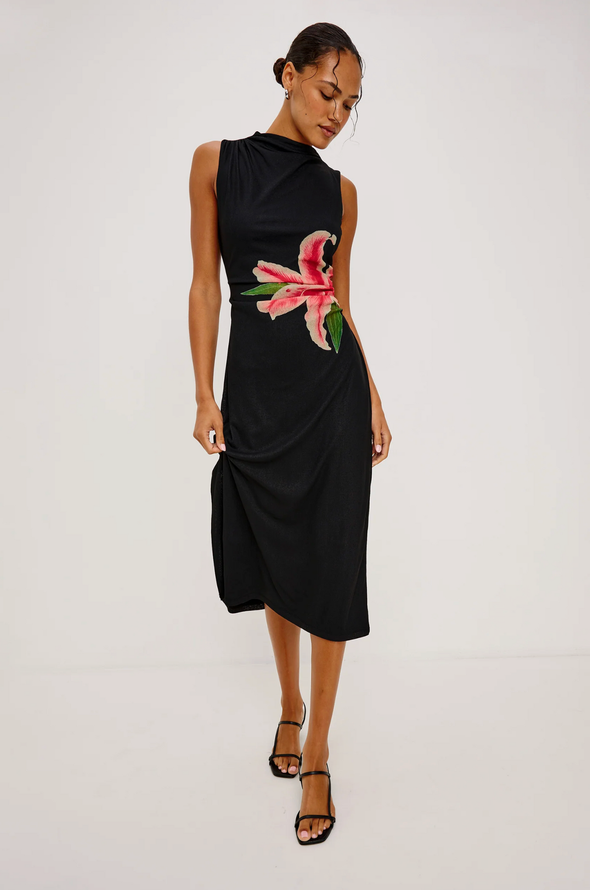 Rails' draped Rebecca midi-dress showcases a classic crew neckline and a floral graphic at the side. This fitted silhouette is completed with a sleeveless cut.
