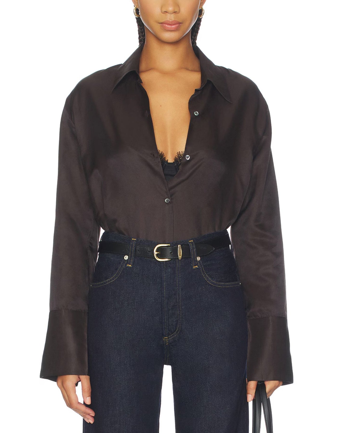 Refined and feminine, the Camilia Shirt is cut from an ultra-smooth cotton-silk blend that drapes effortlessly. The long sleeve silhouette features a clean button front and subtle structure, while deep Chocolate brown adds richness and warmth. Perfect tucked into denim or worn loose over tailored trousers.