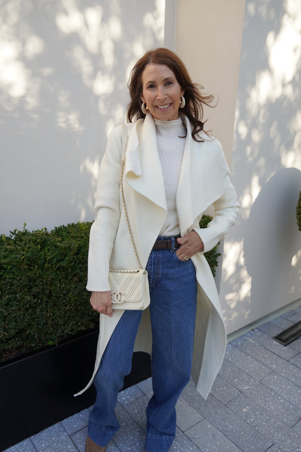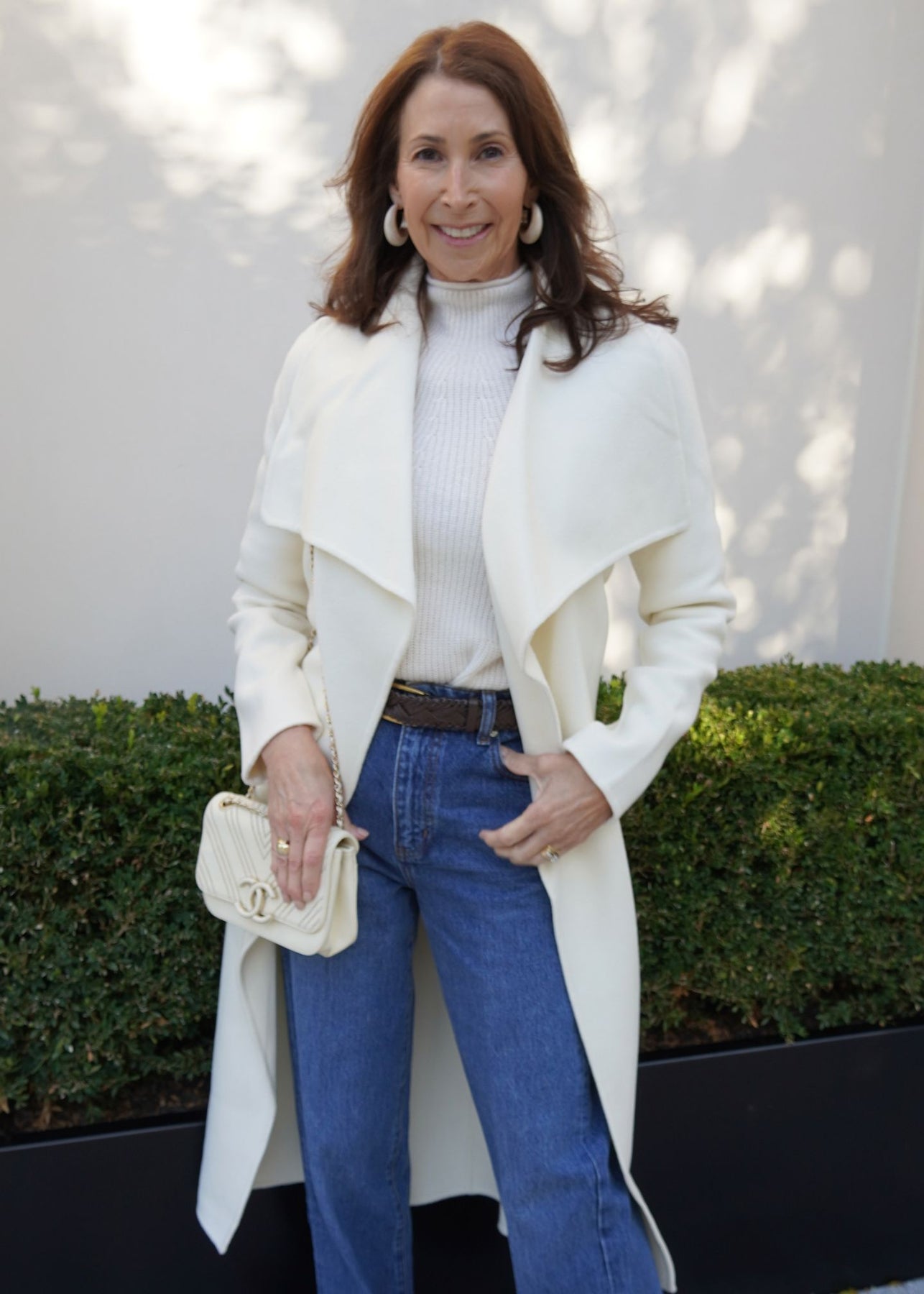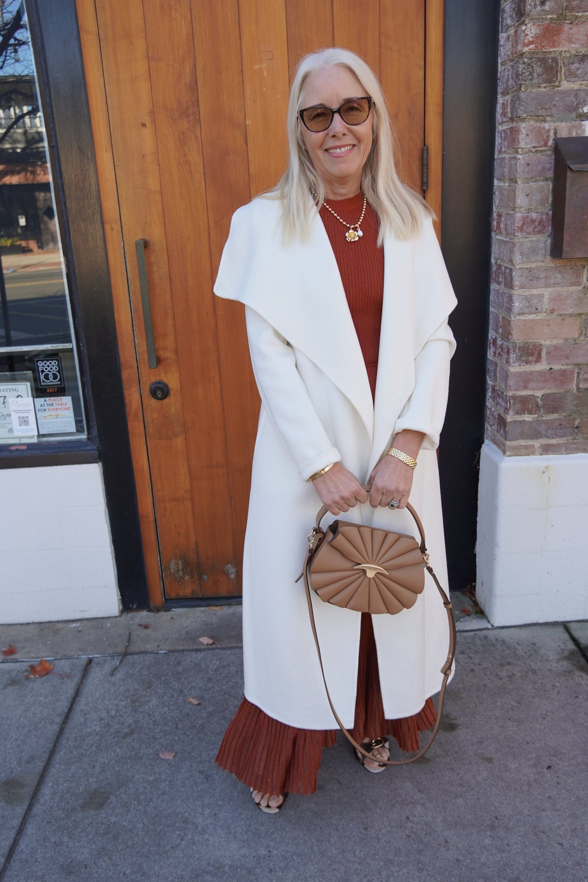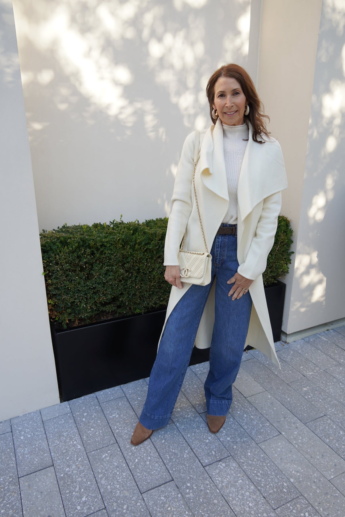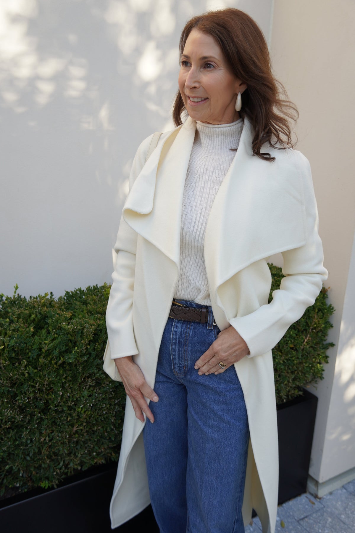 The BRITTA by SOIA & KYO is a simple calf-length double face wool coat dramatized by a deep cascade collar. The hidden button at the collar and detachable tie belt give you the option to wear your coat open and flowy or closed and cozy. Finished with side slits for fluid movement.