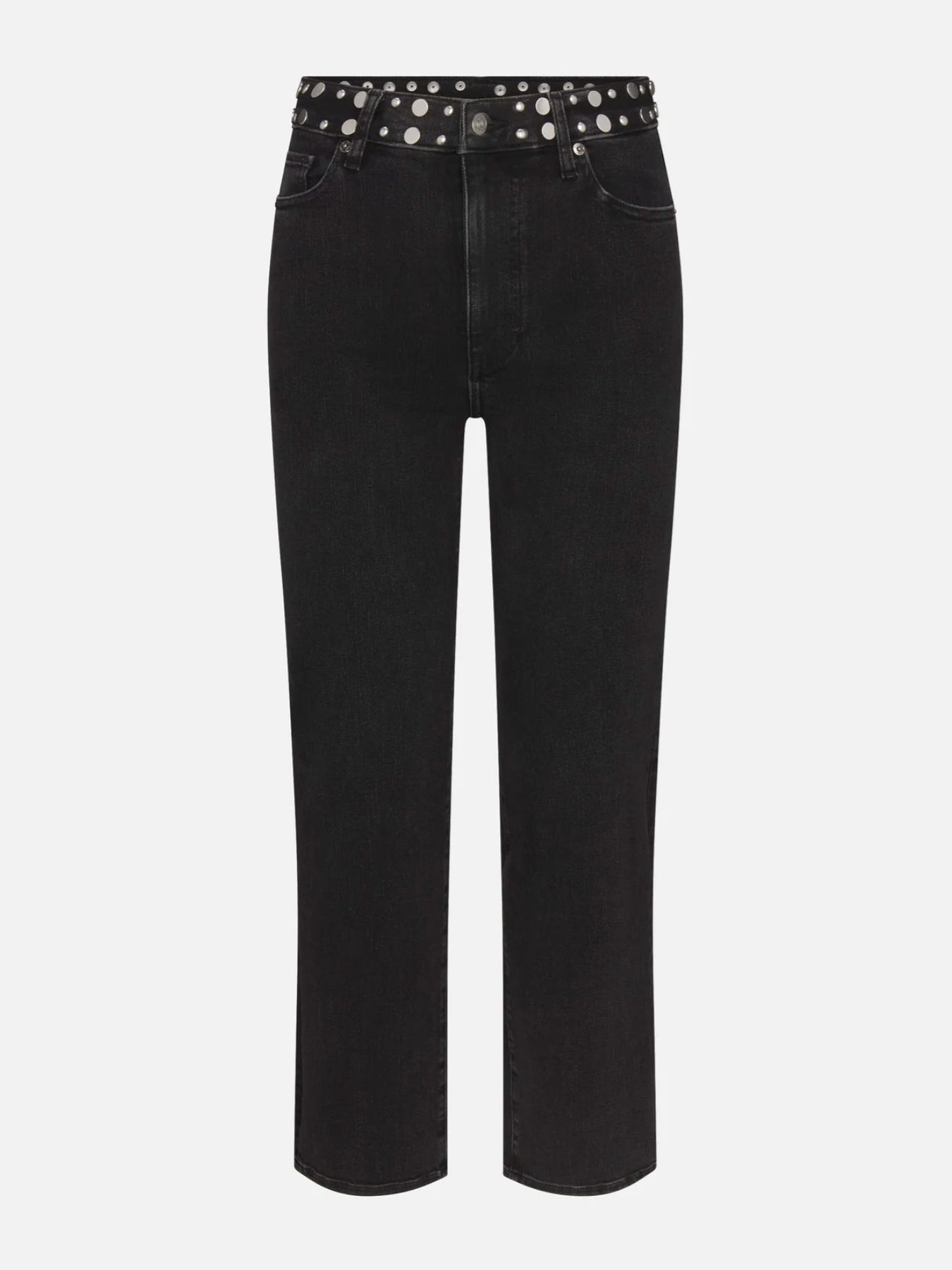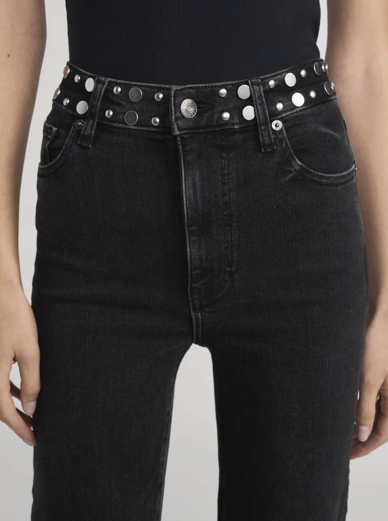 Silver studs line the waistband of this jean for a chic nod to the classic rocker belt. The style is fitted through the hip and thigh, extending into a slim leg with an ankle-length inseam. Crafted from super-stretch denim for effortless all-day wear.