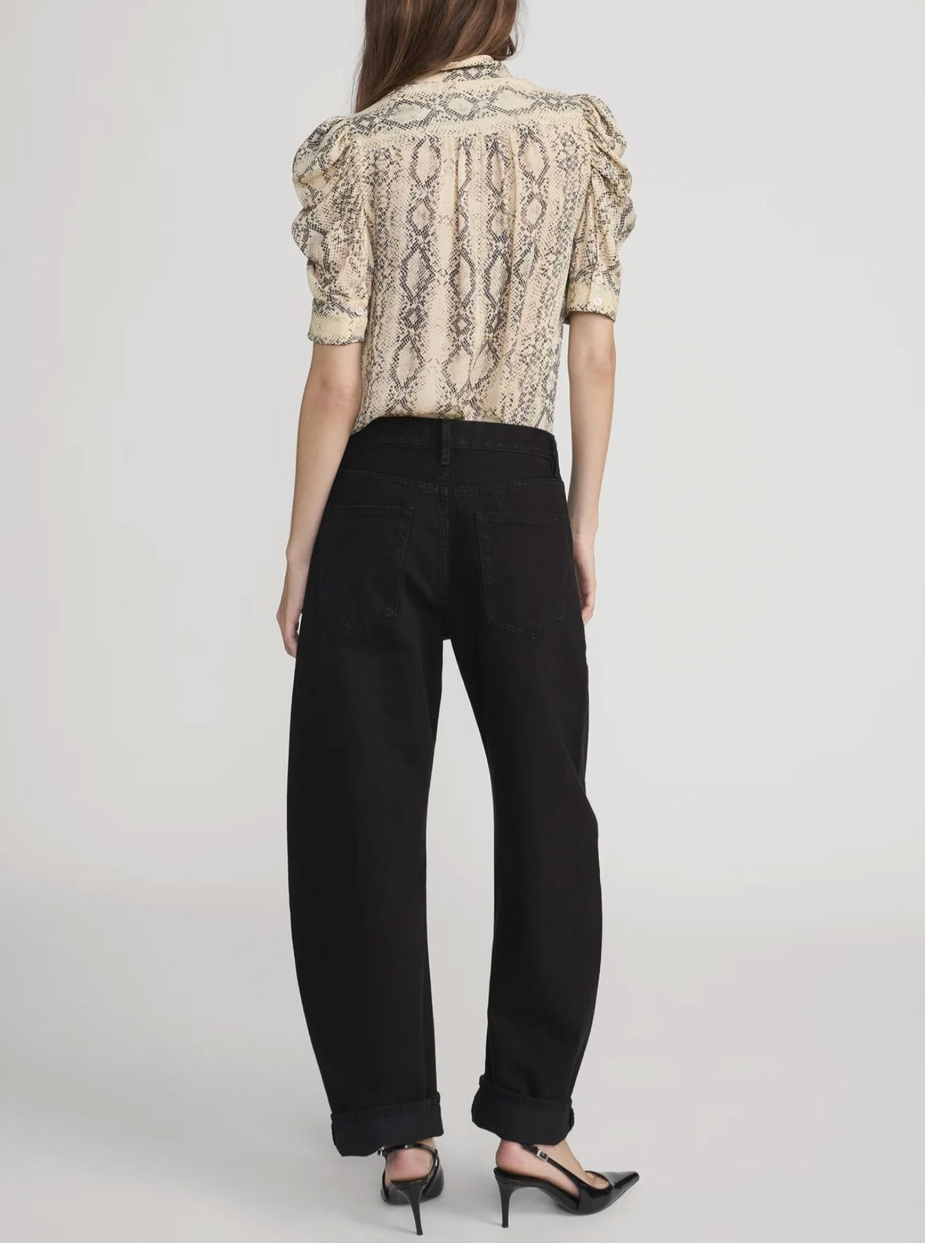 At once modern and feminine, this silk blouse has become a FRAME favorite. Featuring a high neckline and subtle puffed sleeves with ruched detailing, it easily complements any of your denim.