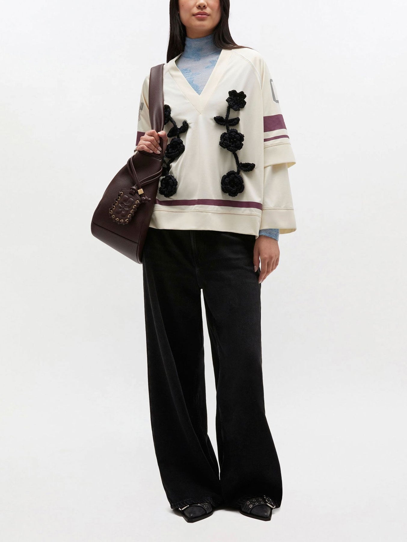 These jeans in black washed denim feature a zip and button closure, 5 pockets, belt loops and a GANNI logo at the back pocket.