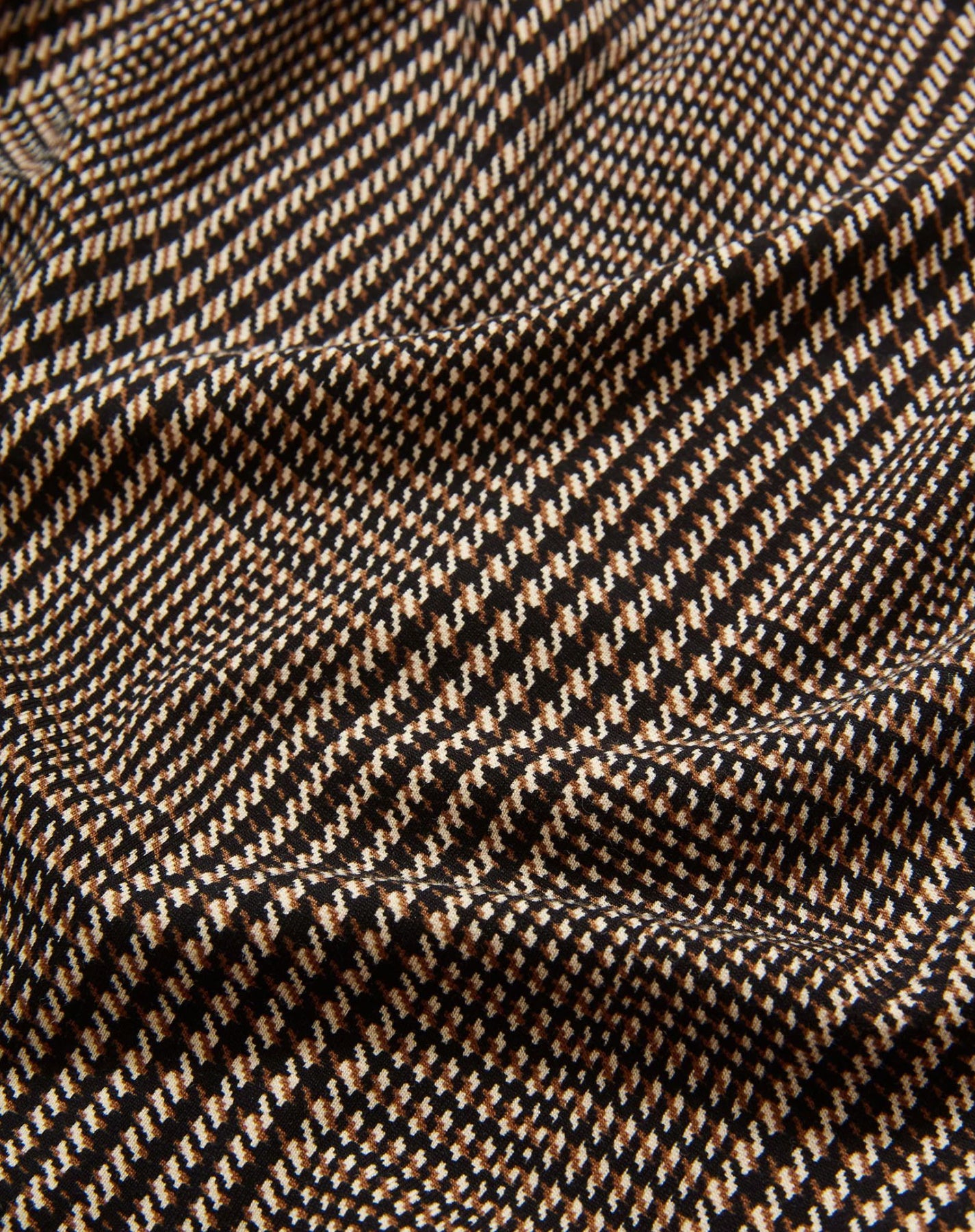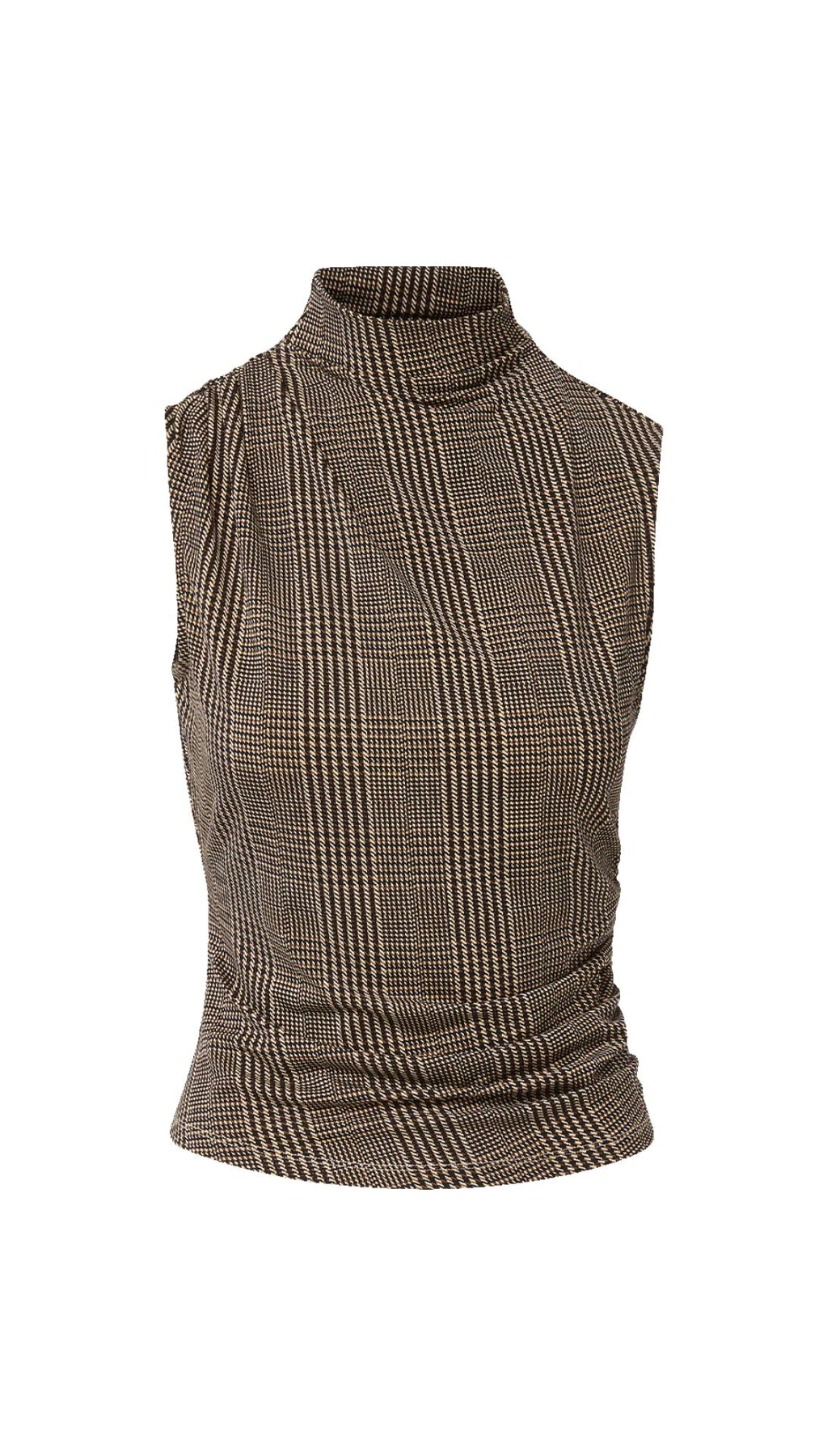 An essential, elevated. Crafted from a soft stretch blend in beige and black houndstooth, the Mylie reimagines the classic tank with a mock neckline and subtle side ruching. Its draped, sleeveless silhouette falls in soft folds, creating fluid, flattering shape. Wear this mock neck top solo with jeans for a polished daytime look, or layer under a tailored suit for the office.
