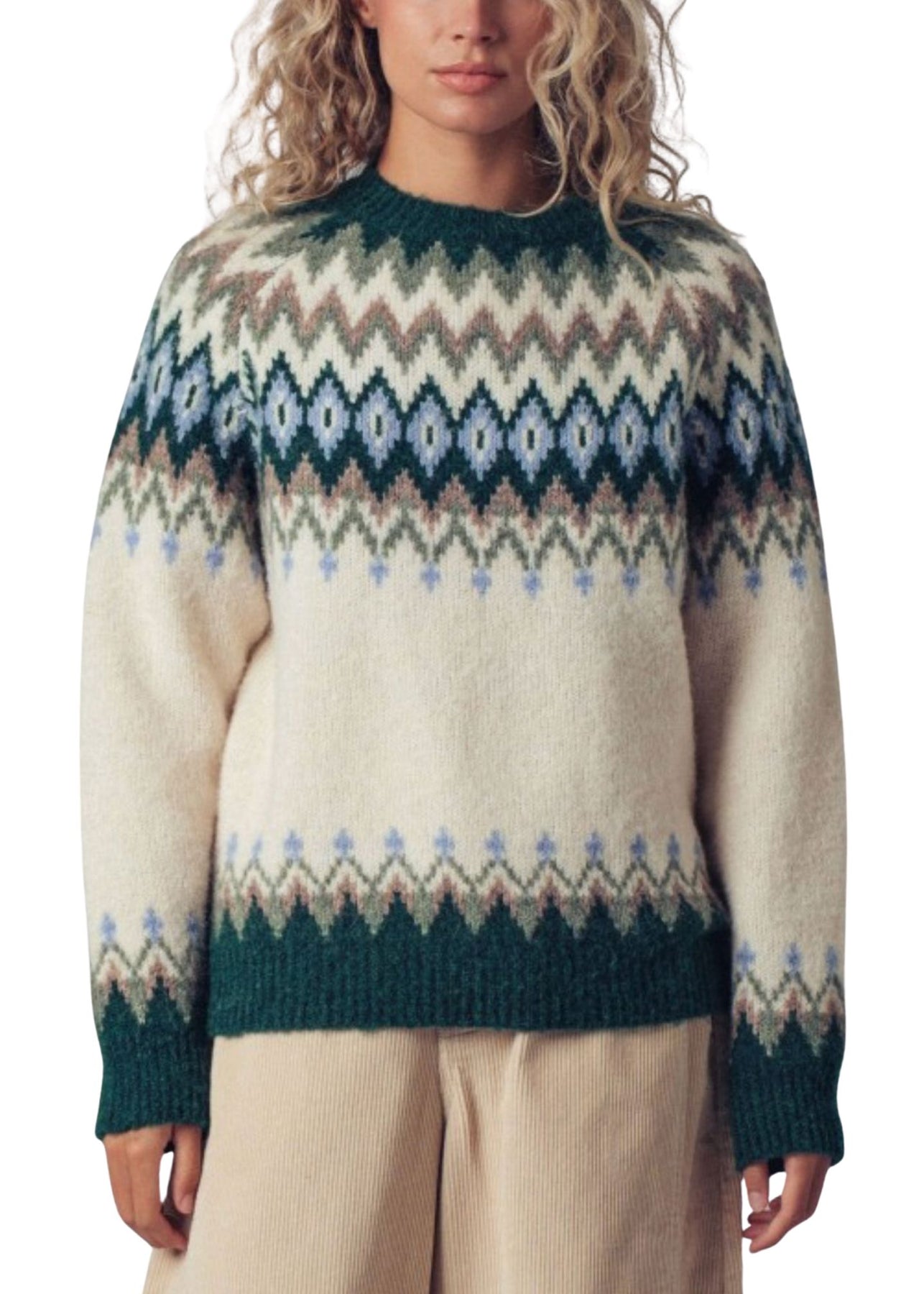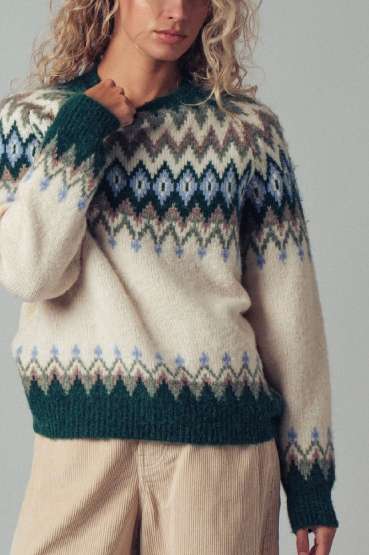 This premium knit sweater features a timeless Fair Isle pattern and is crafted from a soft wool blend for cozy warmth and classic winter style. Its slightly oversized silhouette makes it perfect for layering on chilly days.