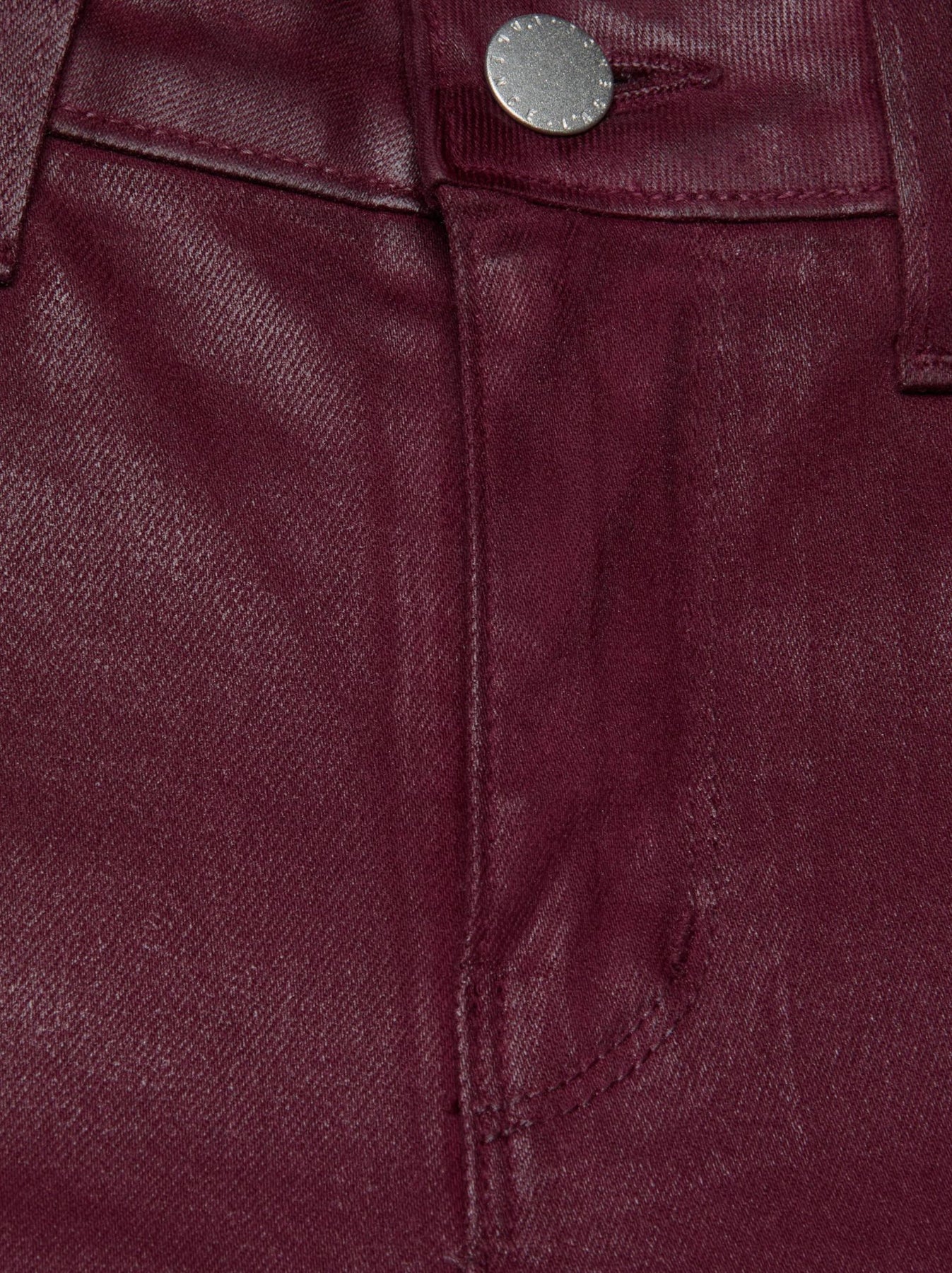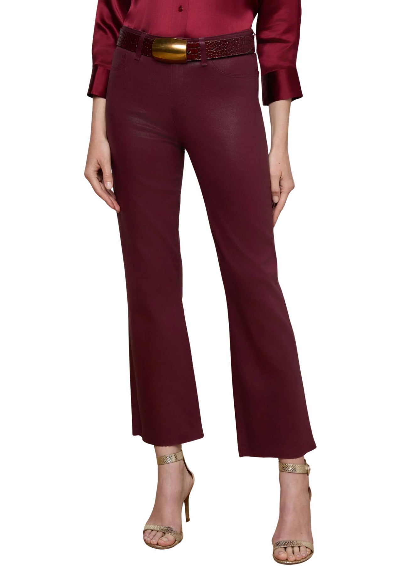 The perfect wear-now cropped flare jean, designed to be compatible with flats or heels. This beautifully proportioned kick flare is now back in dark port leather-alternative coated denim.