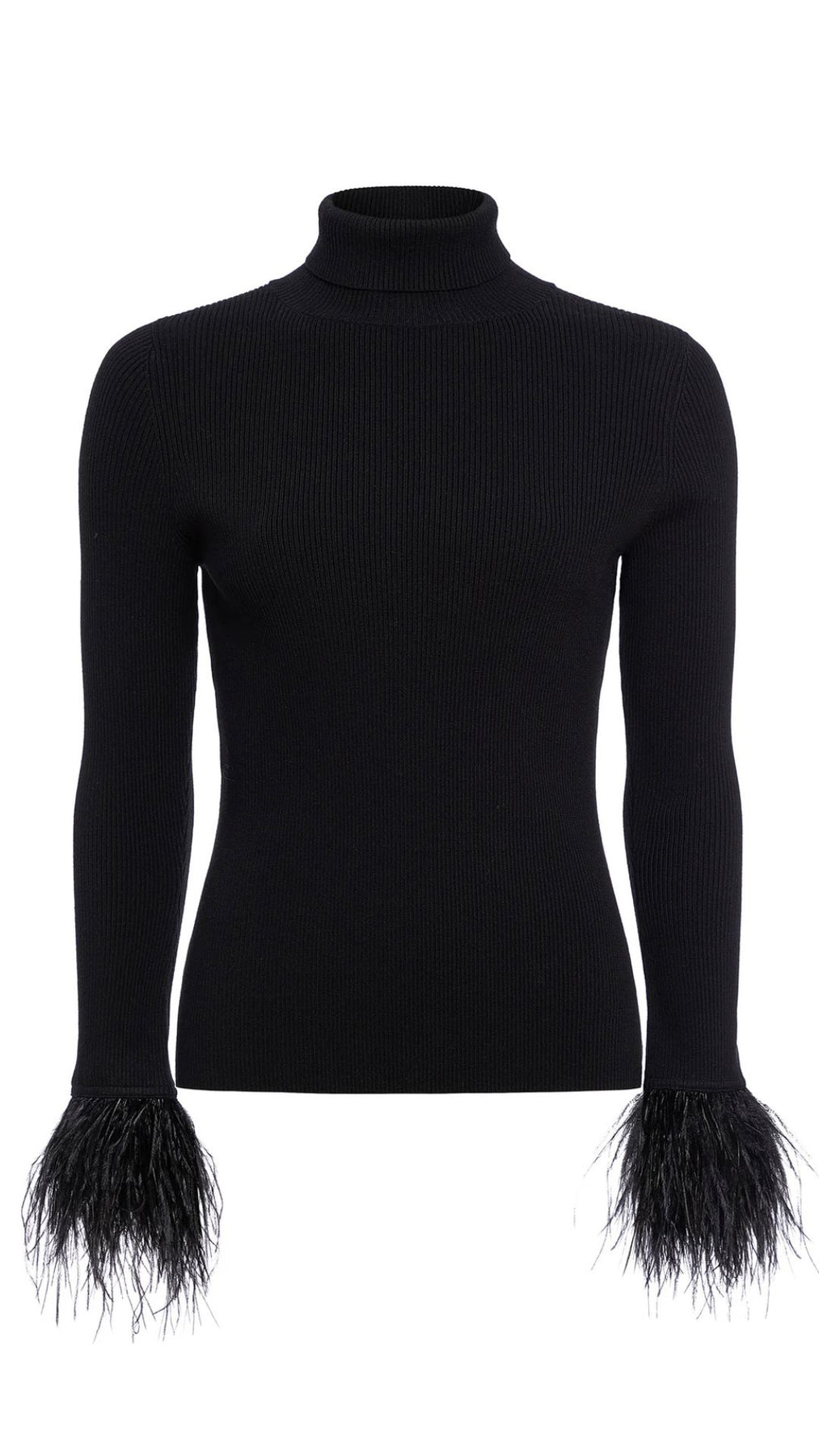 Meet Tucker, a classic turtleneck reimagined for the holidays with flirty feather-trimmed cuffs. The ribbed, form-fitting silhouette is the kind of layering piece holiday capsule wardrobes are built around.