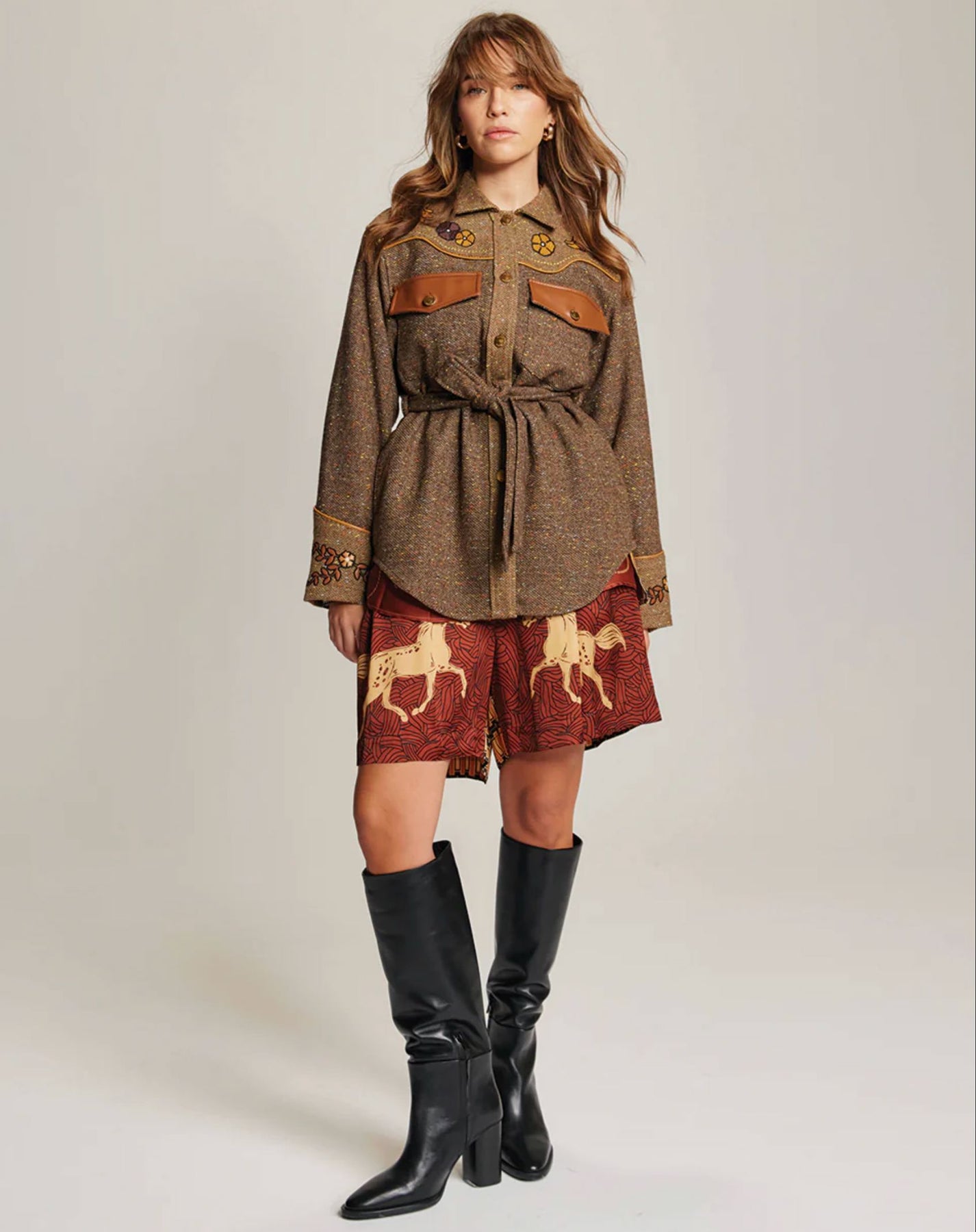 Polyester, wool blend. Button down long sleeve belted jacket.Belt is a sash. Contrasting decorated panels on front and back. Cuffs are ornate and wave shaped. Pair with your favorite skirt or pant for a complete, stylish look.