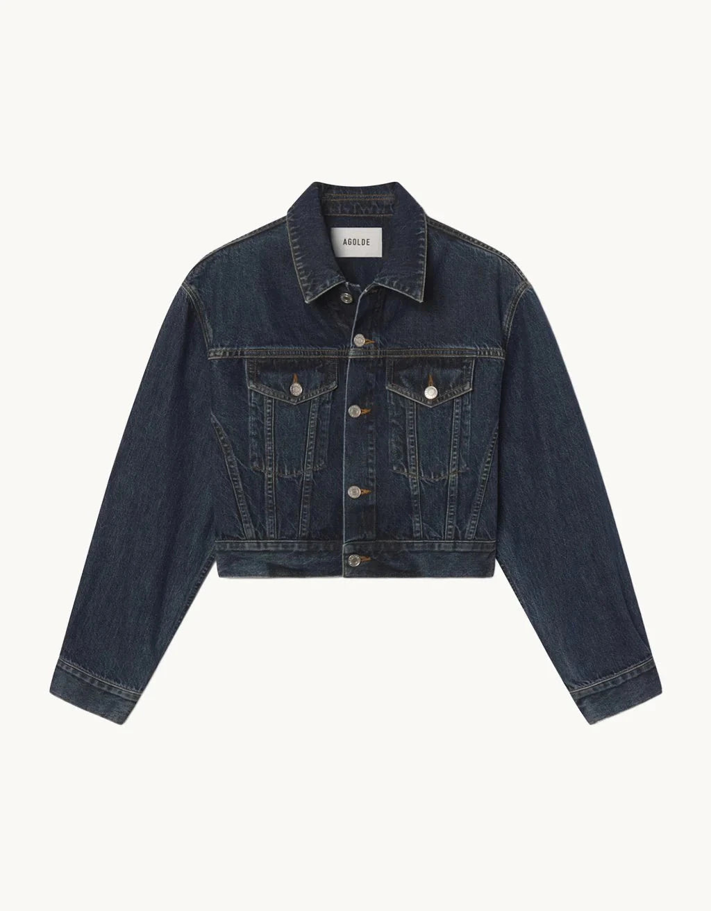 The Radley Jacket is a cropped take on a classic denim trucker—structured through the shoulders with a defined waist. Crafted in a rigid denim, it features a boxy fit and button front closure.