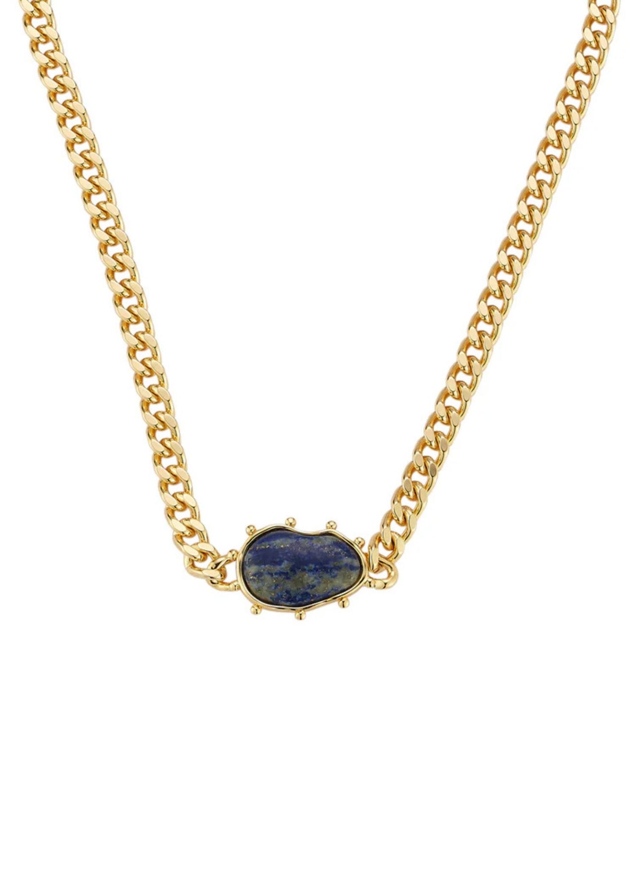A sleek gold curb chain anchored by a deep lapis centerpiece, this minimalist design blends timeless elegance with a touch of earthy allure. Perfect alone or layered for a modern, collected look.