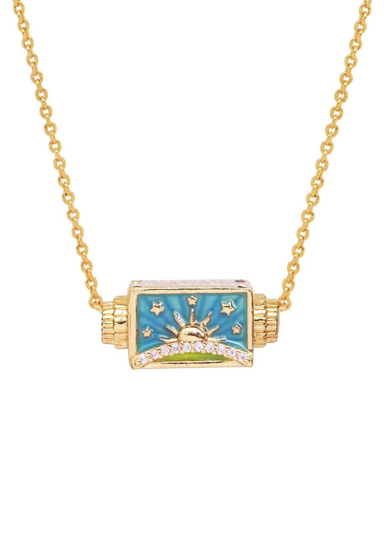 Capture the beauty of the sunset with our Sunset Peaks Spinner Necklace. Featuring a vibrant sun setting behind sparkling CZ mountains and stars rising in the background, this pendant tells the story of day turning to night. The spinning design adds an interactive and dynamic touch, making it a perfect piece for those who love nature and a bit of magic in their style.