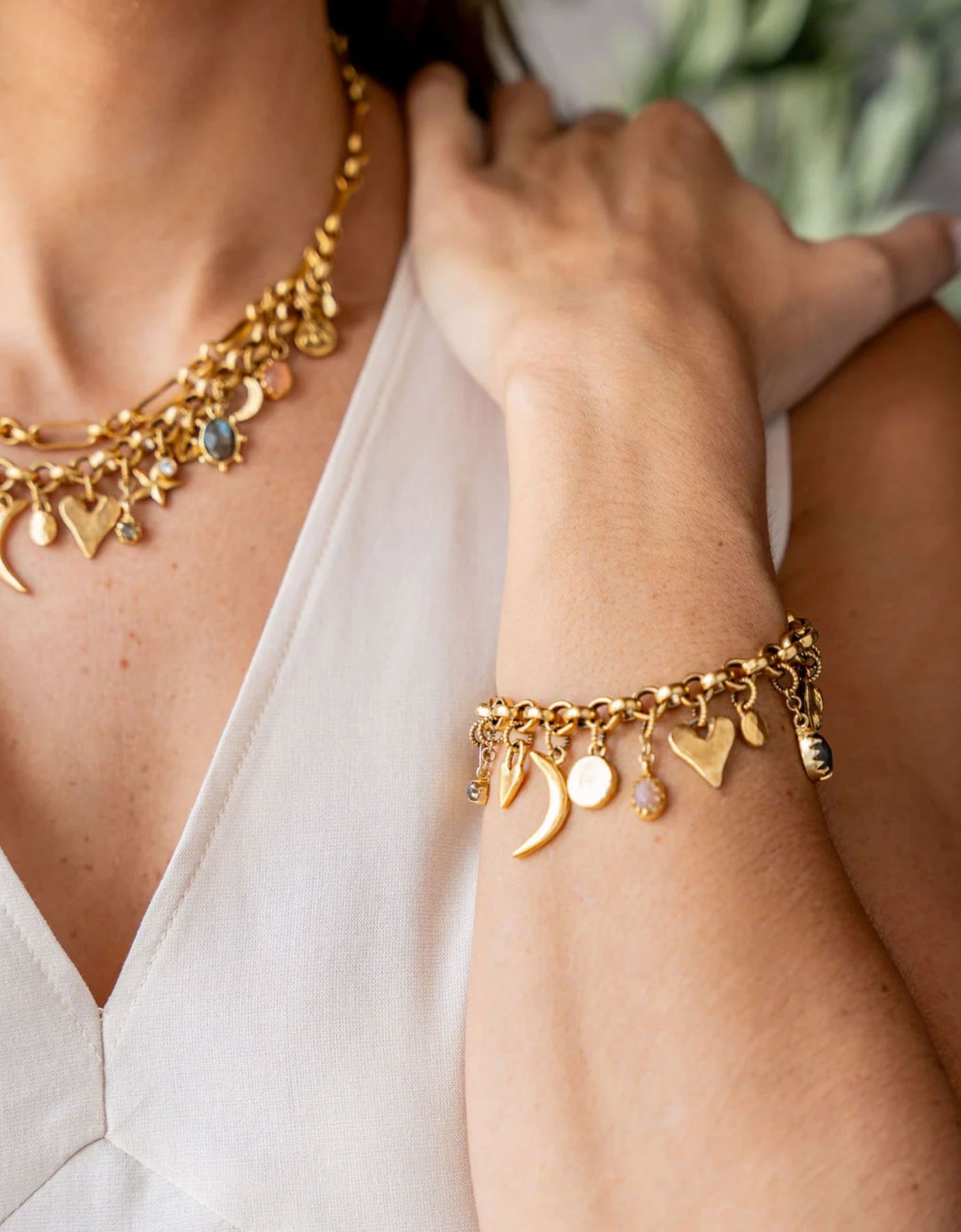 This necklace doesn’t whisper — it speaks in charms. The Talisman Charm Necklace is a cascade of meaning, texture, and storytelling, designed to lay beautifully against your collarbones while catching the light (and conversation). Each charm was handpicked for its symbolic power — hearts, moons, stars, stones — all suspended from a sculptural, double-layer chain that balances delicacy with strength.