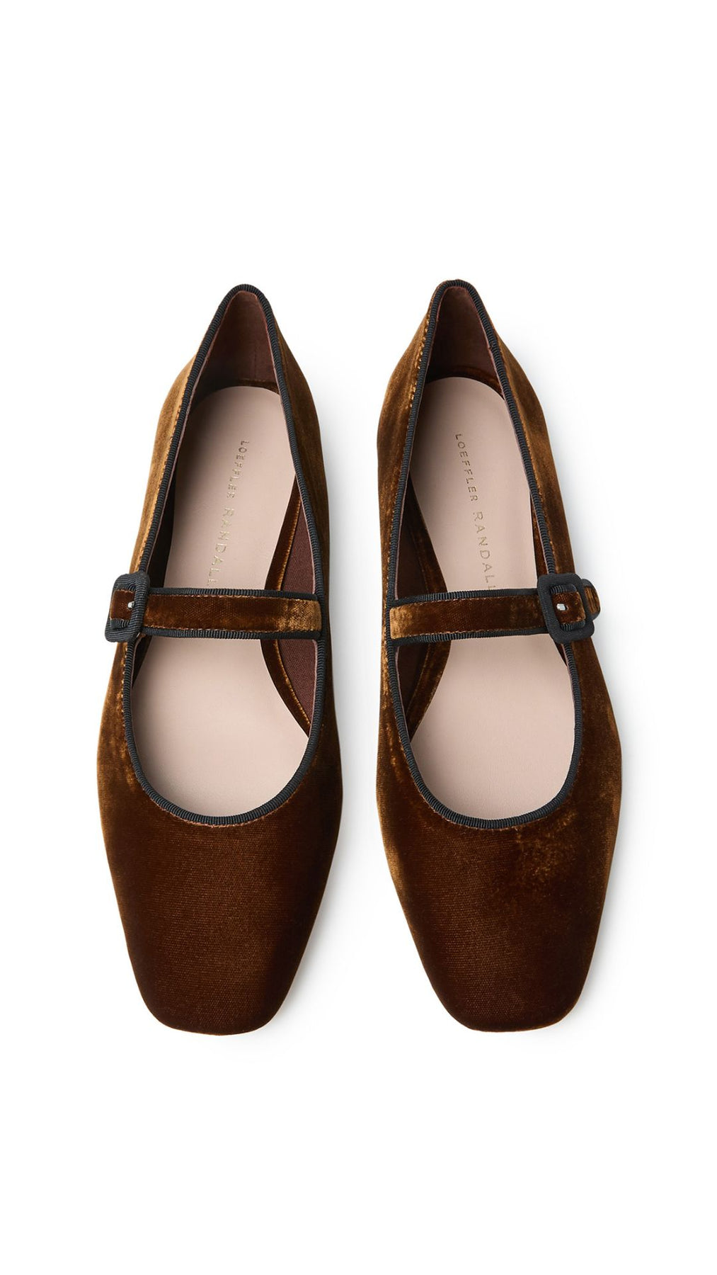 Mary Jane flat in dark brown velvet with delicate black piping. Features a padded leather footbed with gold stamped logo, a square toe, and an adjustable bridge strap with buckle closure.