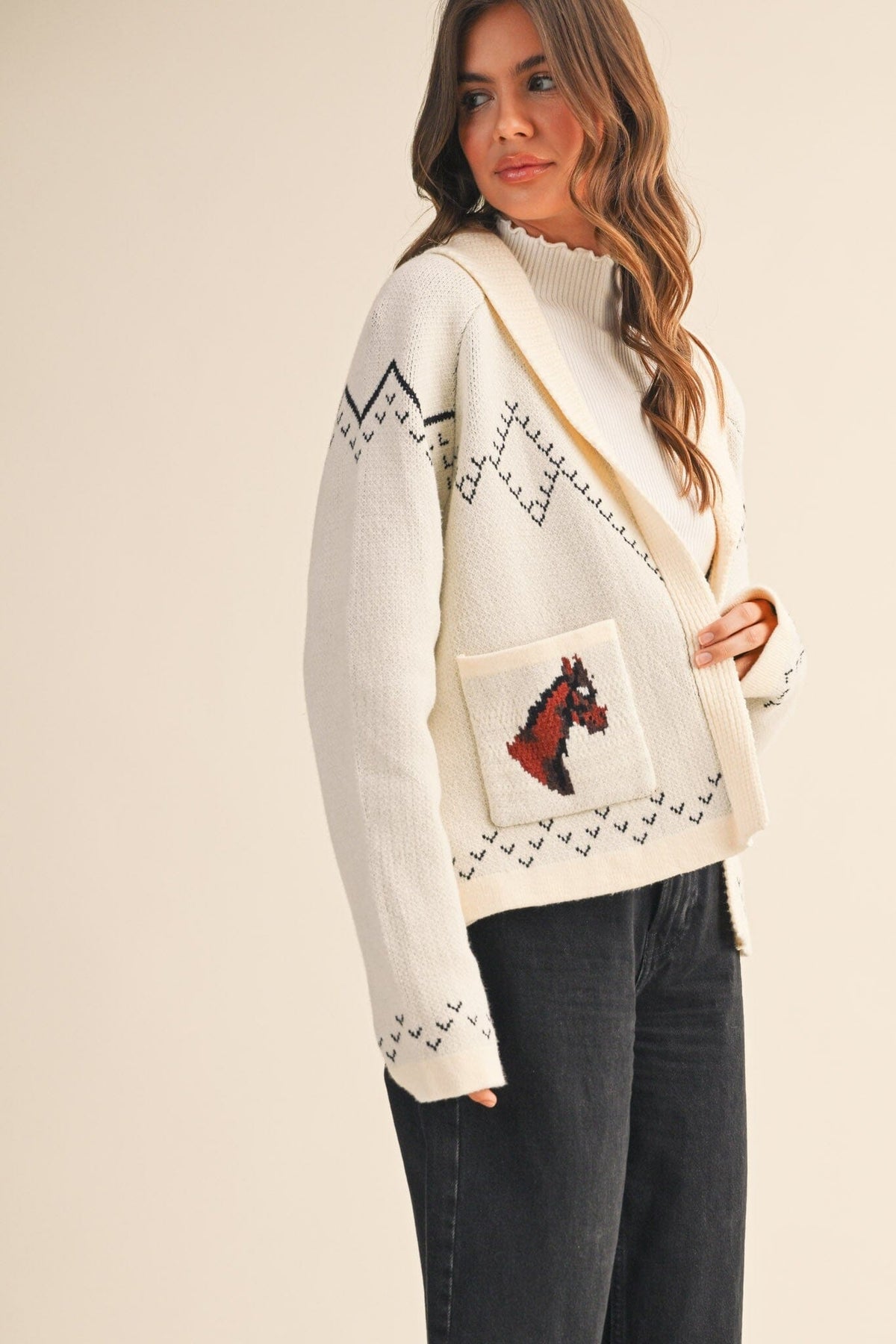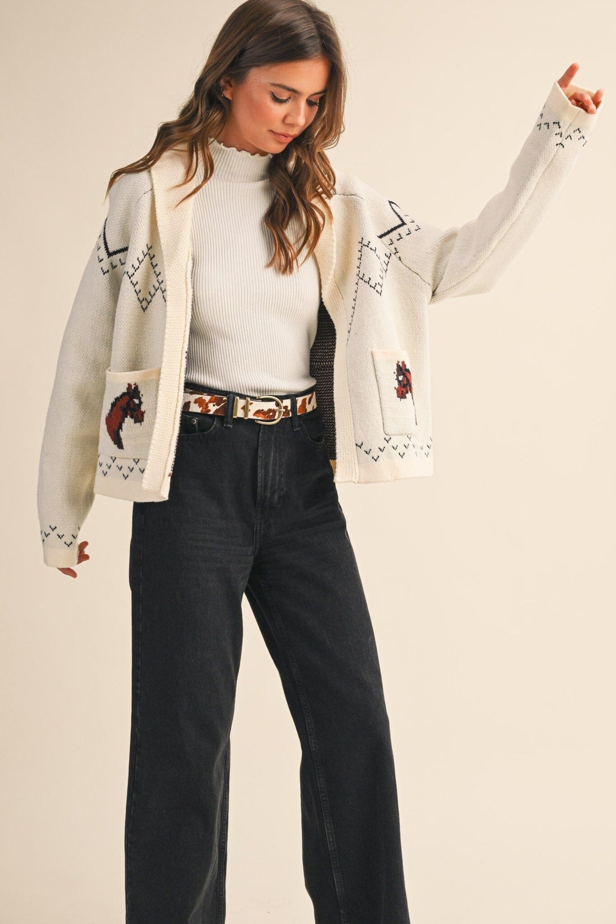 Wrap yourself in warmth and whimsy with the Willow Horse Knit Cardigan. Featuring a charming horse design in neutral fall hues, this soft, cozy knit brings playful comfort to chilly days. Perfect for layering, it adds a fun yet subtle touch to your autumn wardrobe.