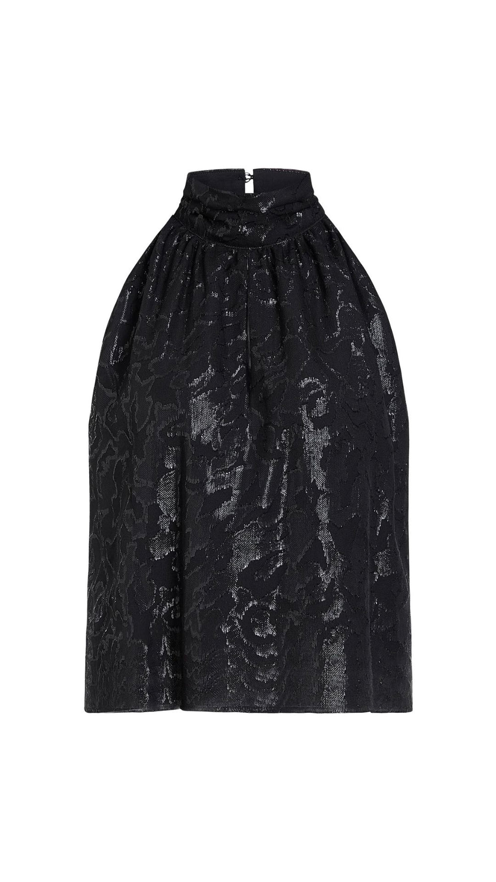Crafted in black metallic clipped silk, the Goldie blouse balances texture, pattern, and subtle shimmer.