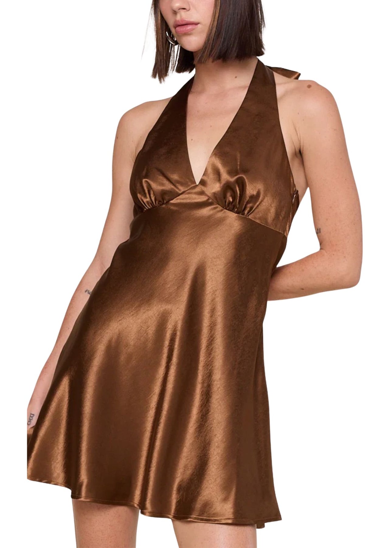 Turn heads with this playful satin mini dress featuring a tie halter and deep V neckline. Its sleeveless, backless design and fit-and-flare silhouette perfectly combine comfort and sass in shiny brown.