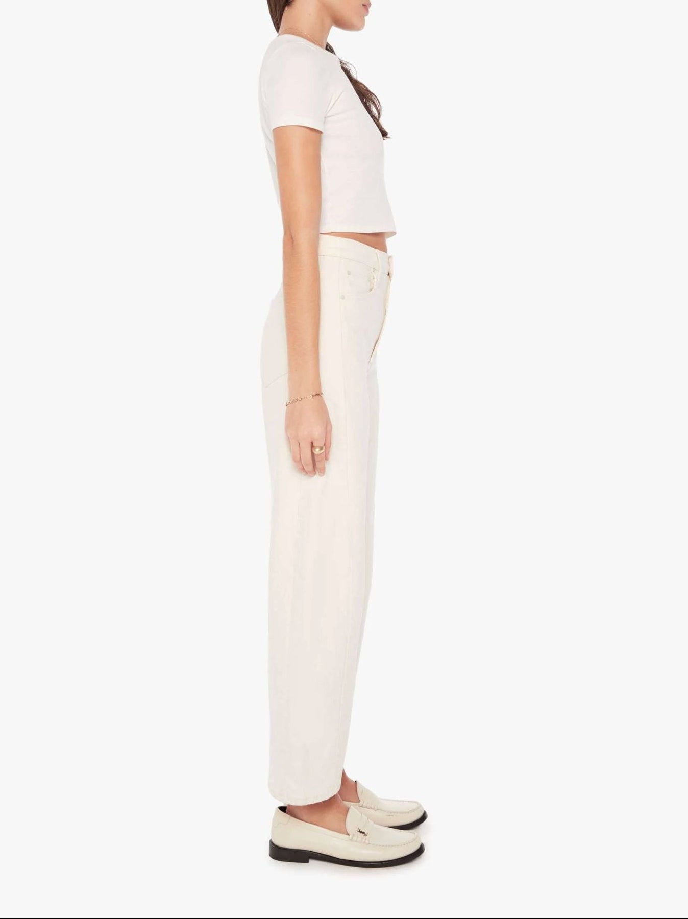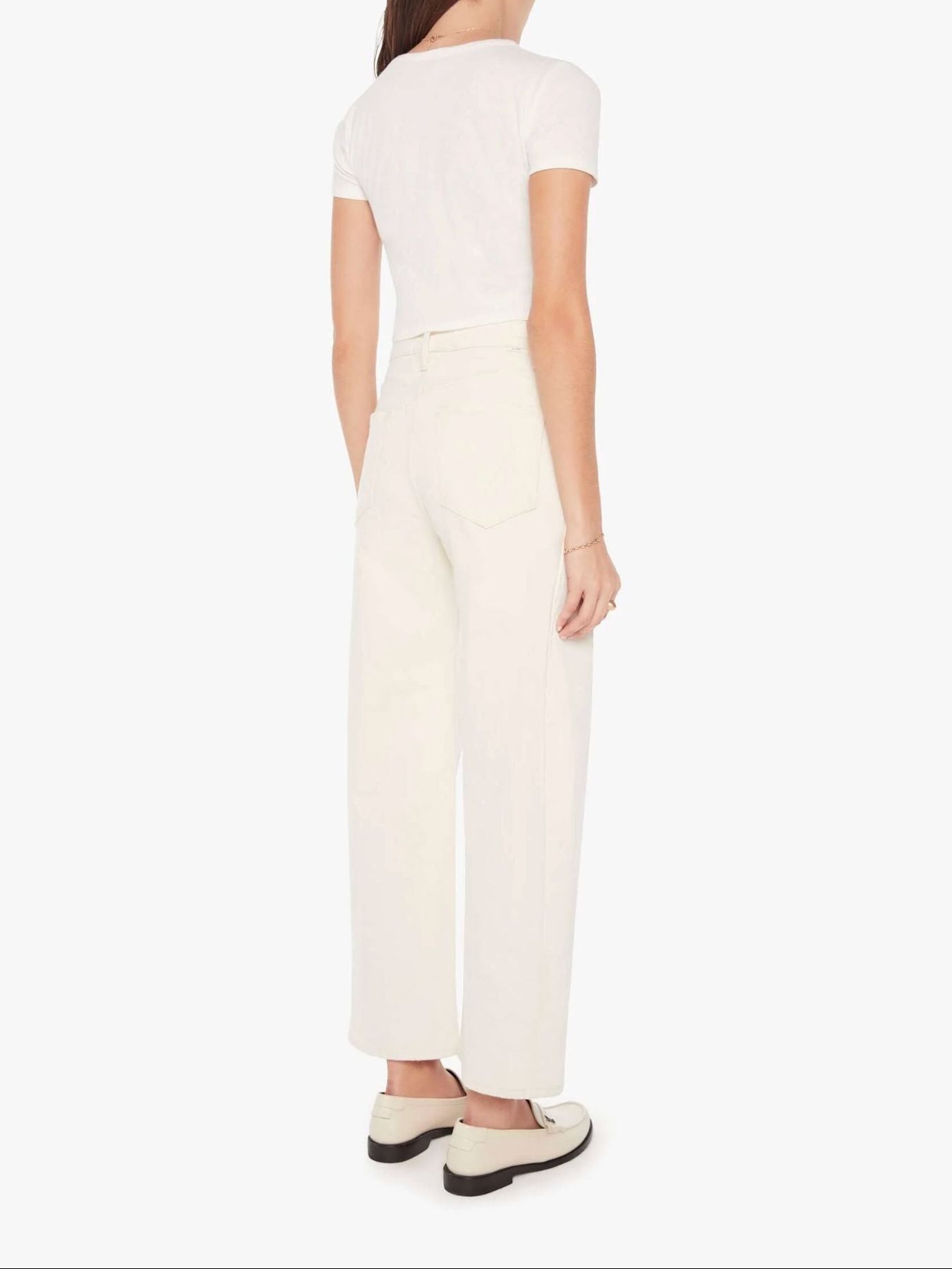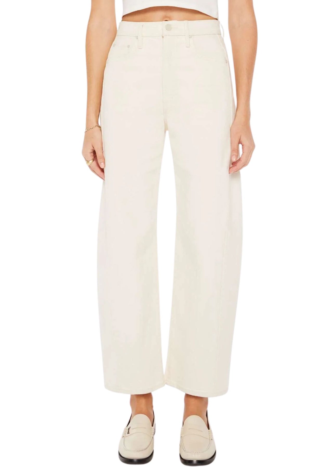 Au naturel. A super high-waisted jean with a wide, curved leg, a 29" inseam, and a clean hem. Cut from a SUPERIOR cotton blend with a touch of stretch, Act Natural is a creamy white hue with tonal hardware.