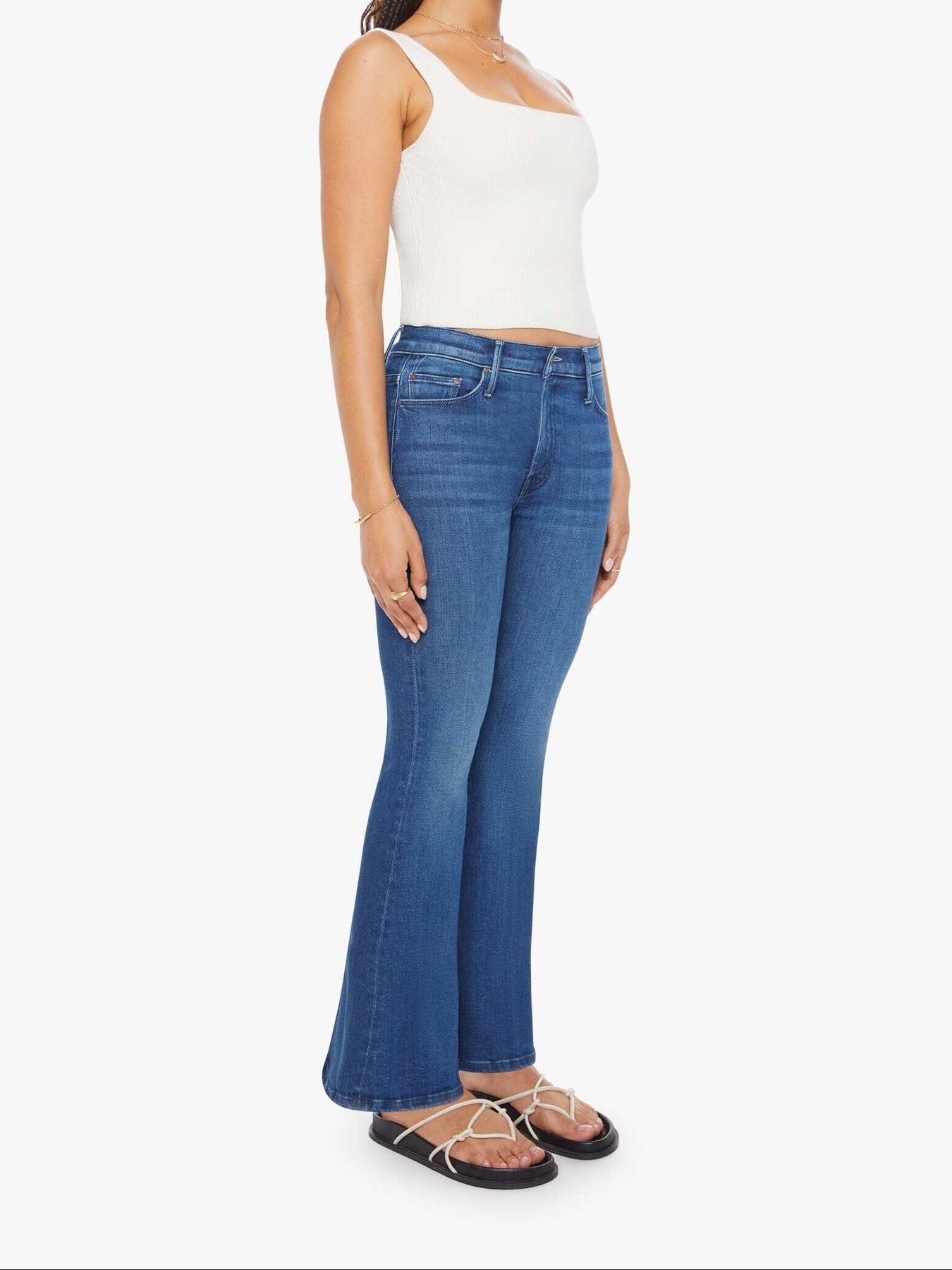 This cult-favorite flare jean has a mid rise with a sneaker-length inseam and a clean hem. Made from denim with a touch of stretch, this is a bright mid-blue wash with whiskering and fading throughout.
