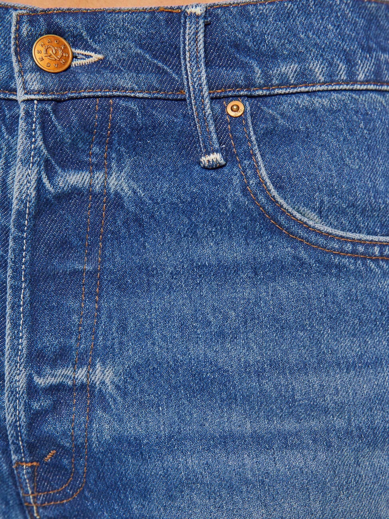 High-waisted jeans from SNACKS!, a collection of unconstrained silhouettes leaning into exaggerated shapes and extreme proportions. Experimental and non-era specific. For everyone, or not. The wide straight-leg jeans are designed to sit on the hips with a slouchy fit, button-fly and a long 31-inch inseam with a cuffed hem. They're made from rigid denim in a classic mid-blue with a pretzel-detailed button and candy-inspired interior rivets. Would you like a treat?