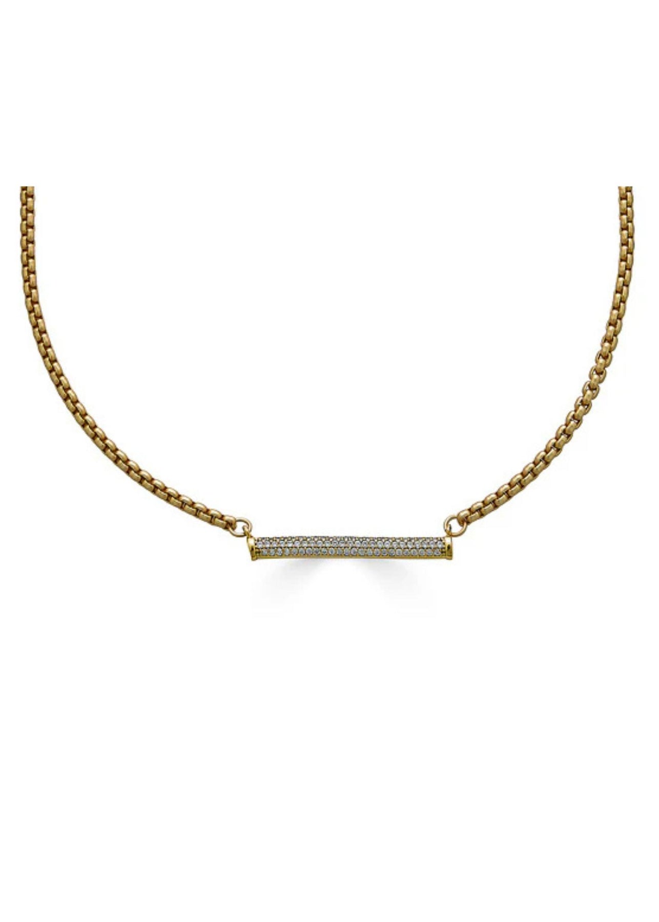 A modern and minimalist necklace defined by its casual elegance, this gold pave bar chain necklace will elevate any day-to-day look. Featuring a Venetian box chain with a bar pendant beautifully studded in pave CZs for just the right touch of sparkle.