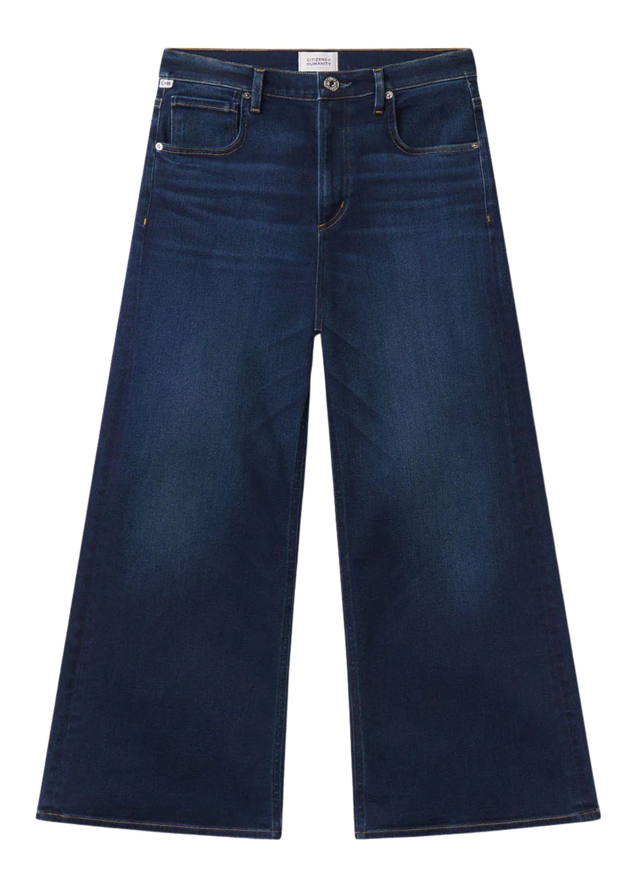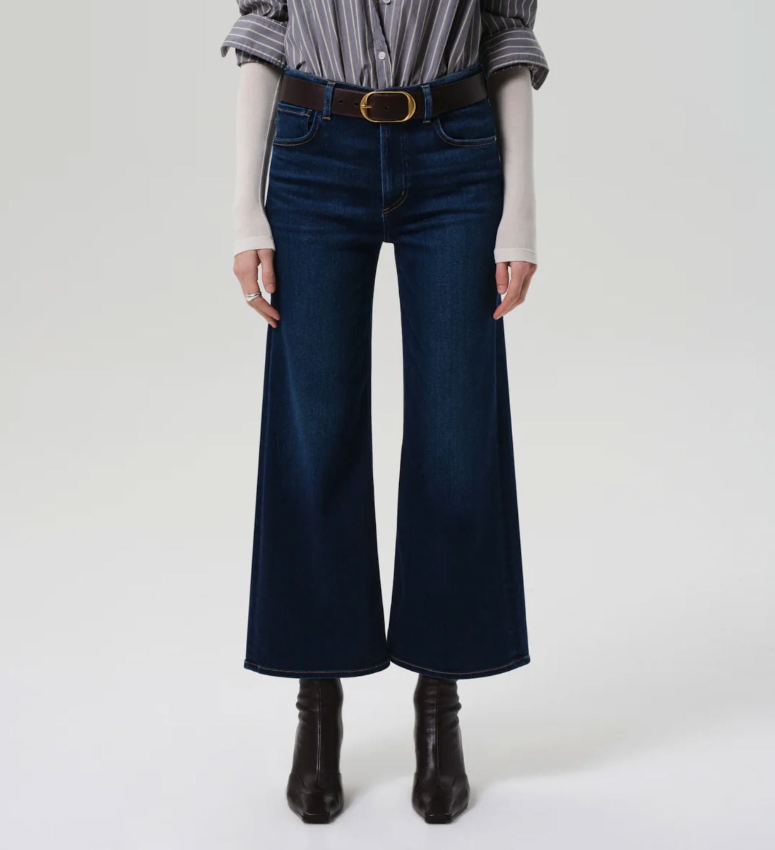 The Lyra is a vintage-inspired wide leg designed with a high rise, relaxed top block, and cropped 27" inseam. Crafted from soft stretch denim with a lightweight feel, Dakota is a dark-to-medium indigo wash with subtle whiskering and fading. Finished with a clean hem, it’s a versatile silhouette that works with sneakers, boots, or a refined heel.