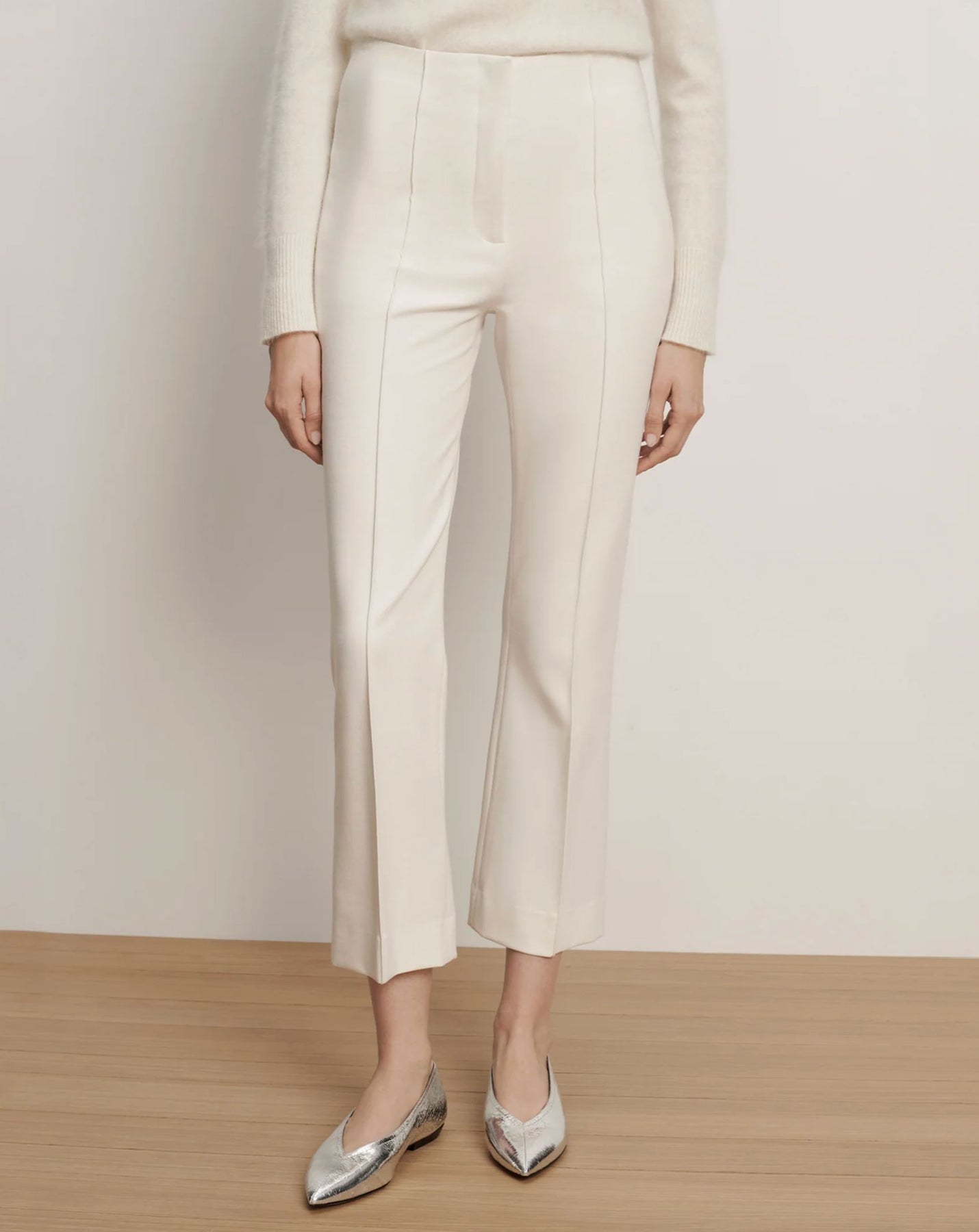 One of our best-selling silhouettes for a reason. Crafted from a premium stretch-blend in white, the Kean is a streamlined trouser with a slim leg and cropped, slightly flared hem. A high waist elongates the figure, finished with welt pockets for a tailored look. Pair this ankle-length pant with a cashmere sweater for a polished everyday look.