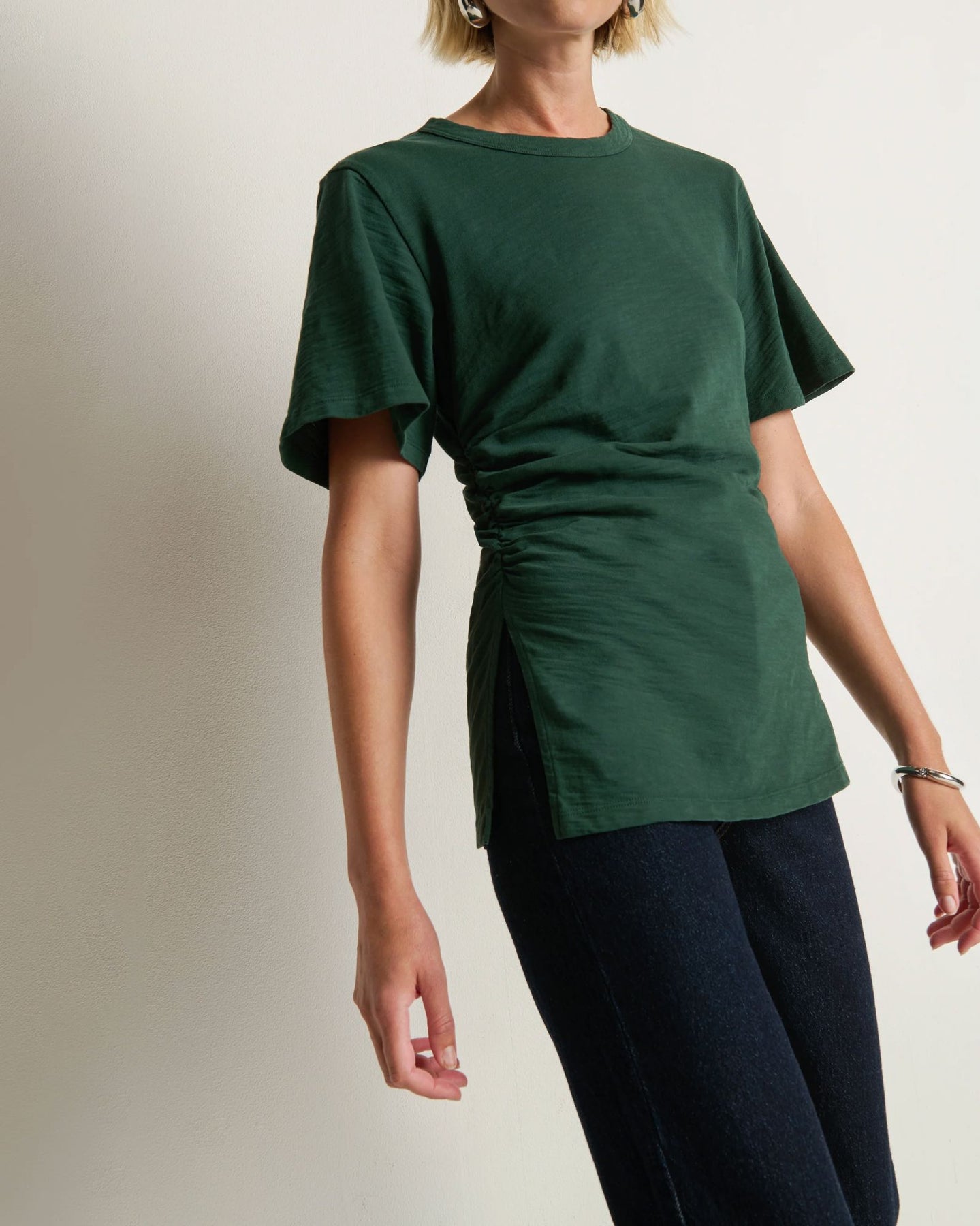 Not your basic tee. The Vella Tee is a feminine essential with a refined touch—crafted from 100% cotton jersey in a fitted silhouette. Flutter short sleeves and side slit details bring graceful movement to the everyday.