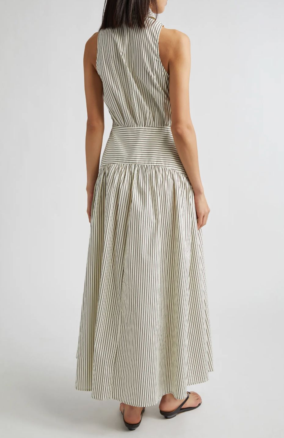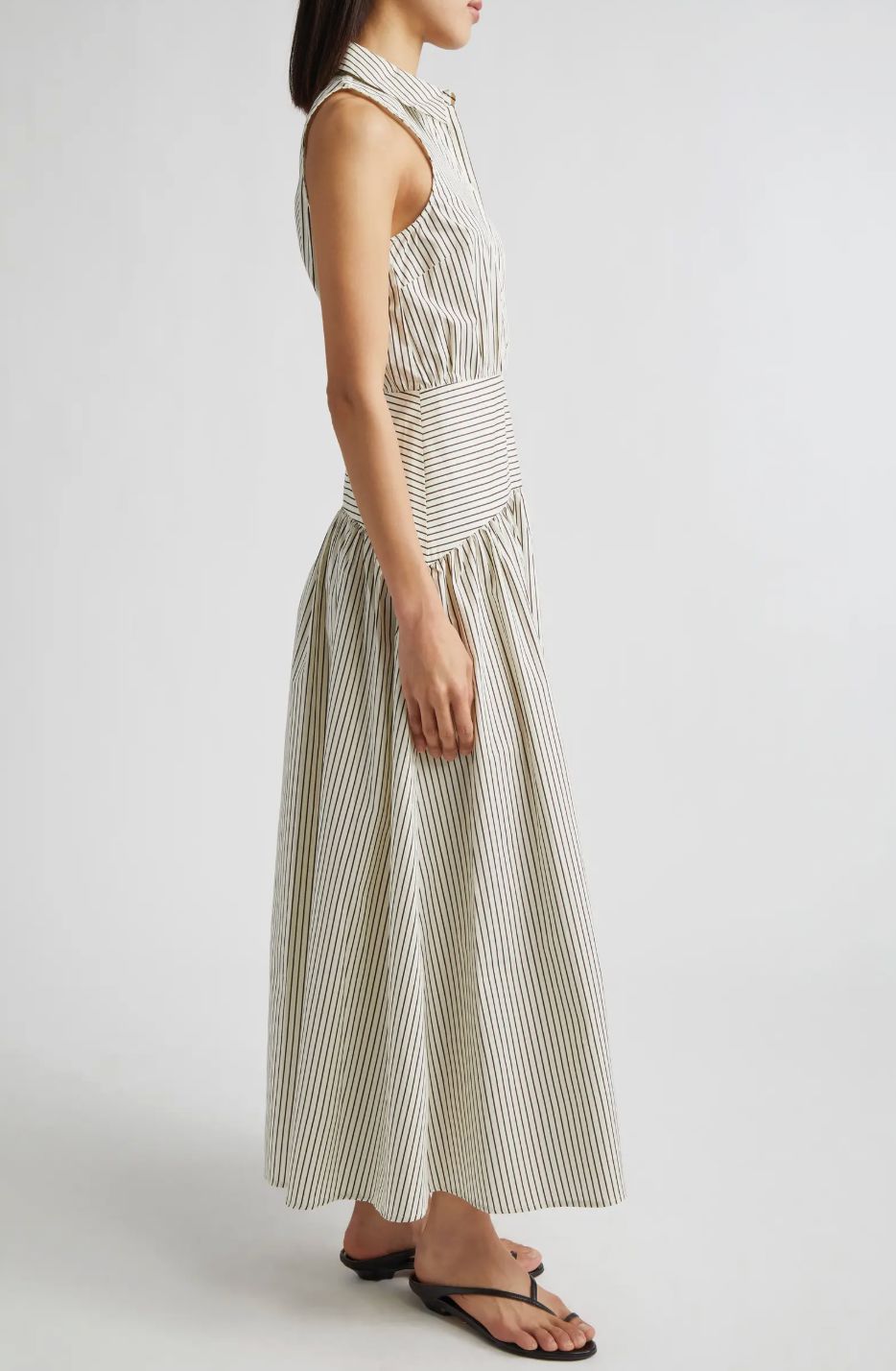 Paneling along the midriff creates a drop-waist effect in this crisp cotton-blend maxi dress topped with a sharp point collar and button-up bodice that bring tailored polish to your look.