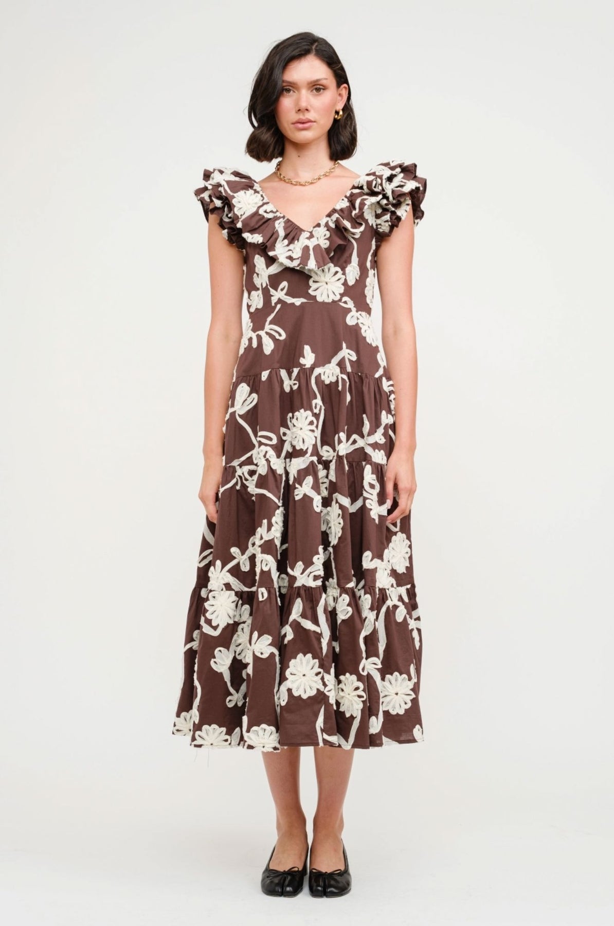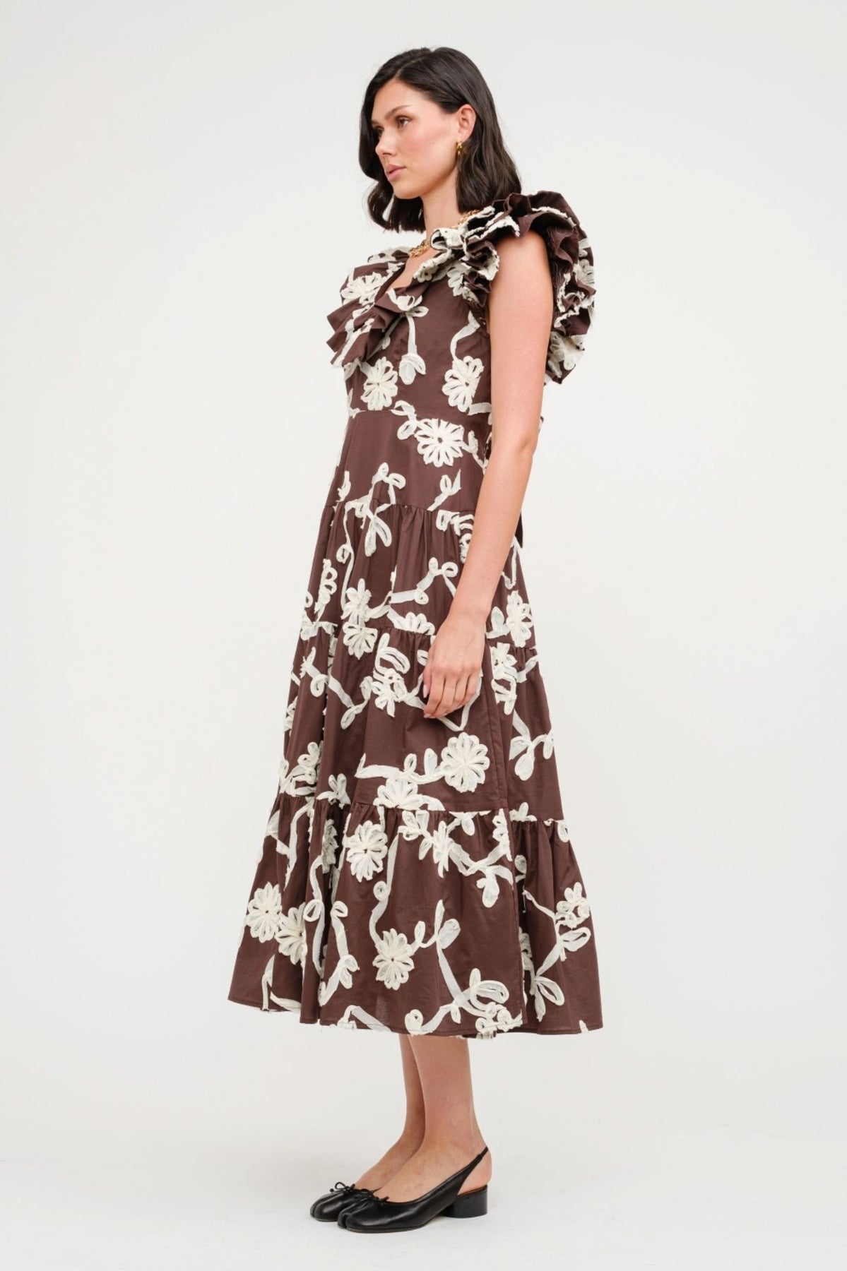 A striking balance of romance and bold contrast, this ivory maxi dress is adorned with black floral embroidery that blooms across each tier. Cascading ruffles frame the neckline and shoulders, while the flowing skirt offers graceful movement, perfect for evening soirées or daytime celebrations.