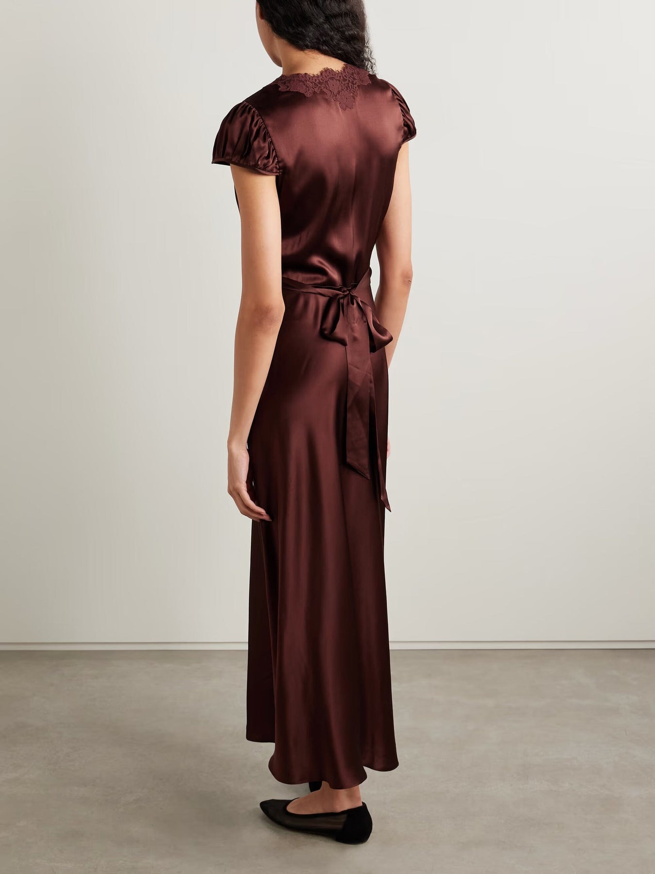 DÔEN's 'Coraline' maxi dress takes cues from romantic lingerie. Designed with lace trims along the V-neckline, it's made from panels of lustrous silk-satin that are strategically cut and placed to draw the eye inward and has gently puffed sleeves. Adjust the slim ties to accentuate the waist.