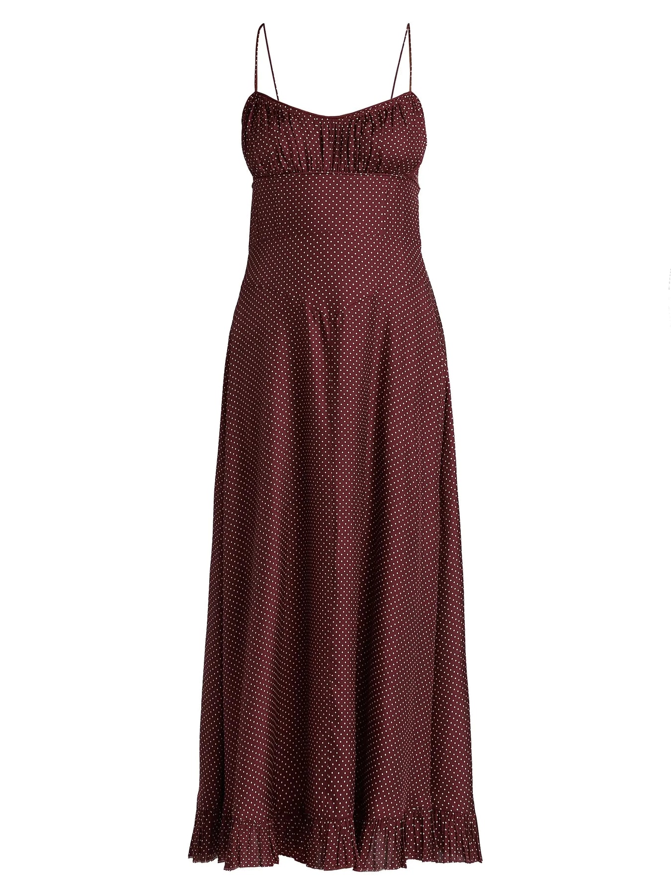 In a swingy silk-viscose twill and rendered in our Burgundy Colette Dot, the Rosaria Dress features a square neckline, ultra-skinny spaghetti straps, and a ruched bust. A fitted waist with an invisible side zipper gives way to an ankle-grazing A-line skirt with a ruffle trim.