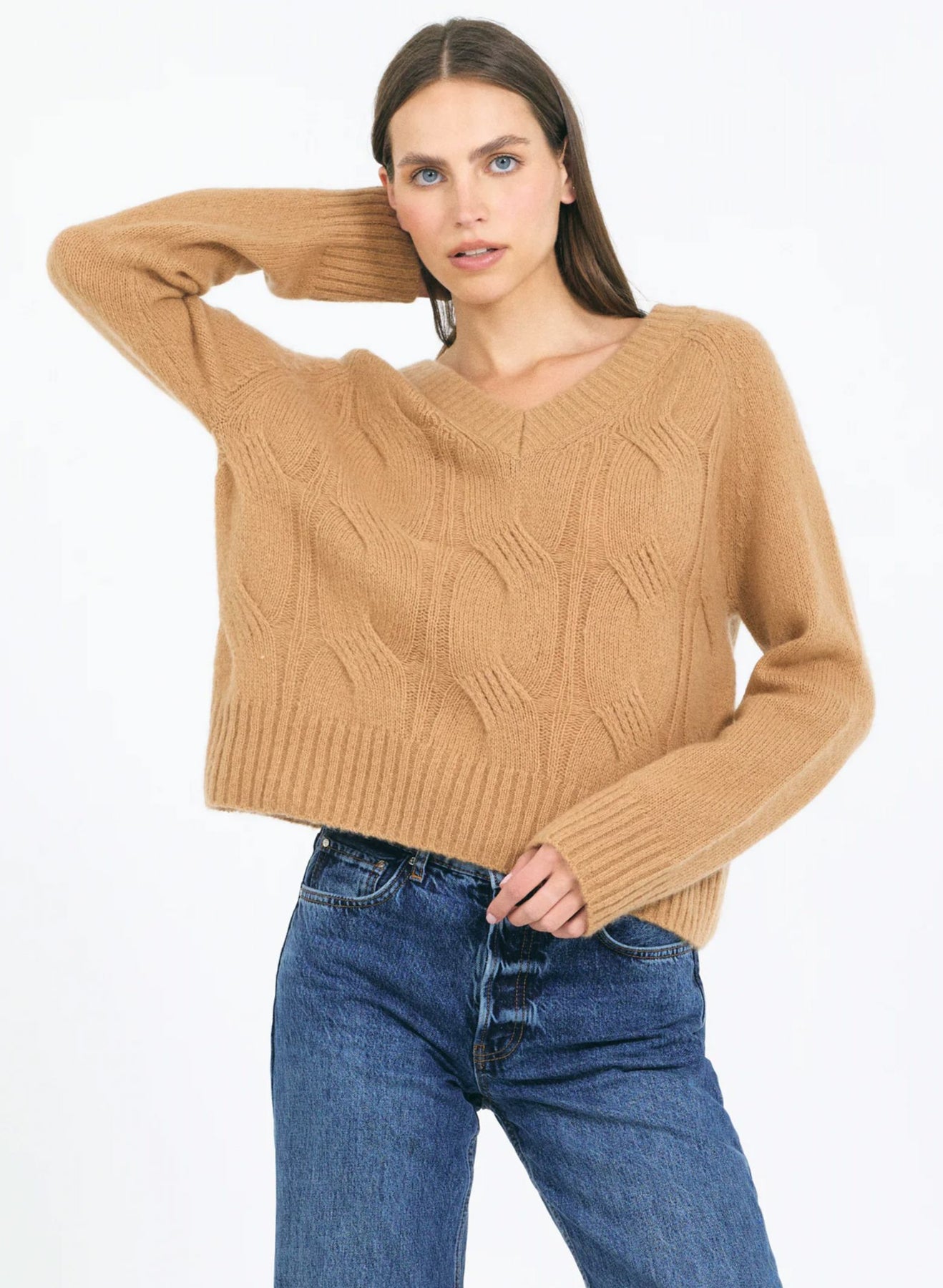 The Mabel Cable Vneck Pullover is a fresh take on a classic cable knit, made from a soft blend of merino wool and cashmere. It features a flattering V-neckline and a textured cable design. Easy to dress up or down, it’s a cozy staple with classic style.