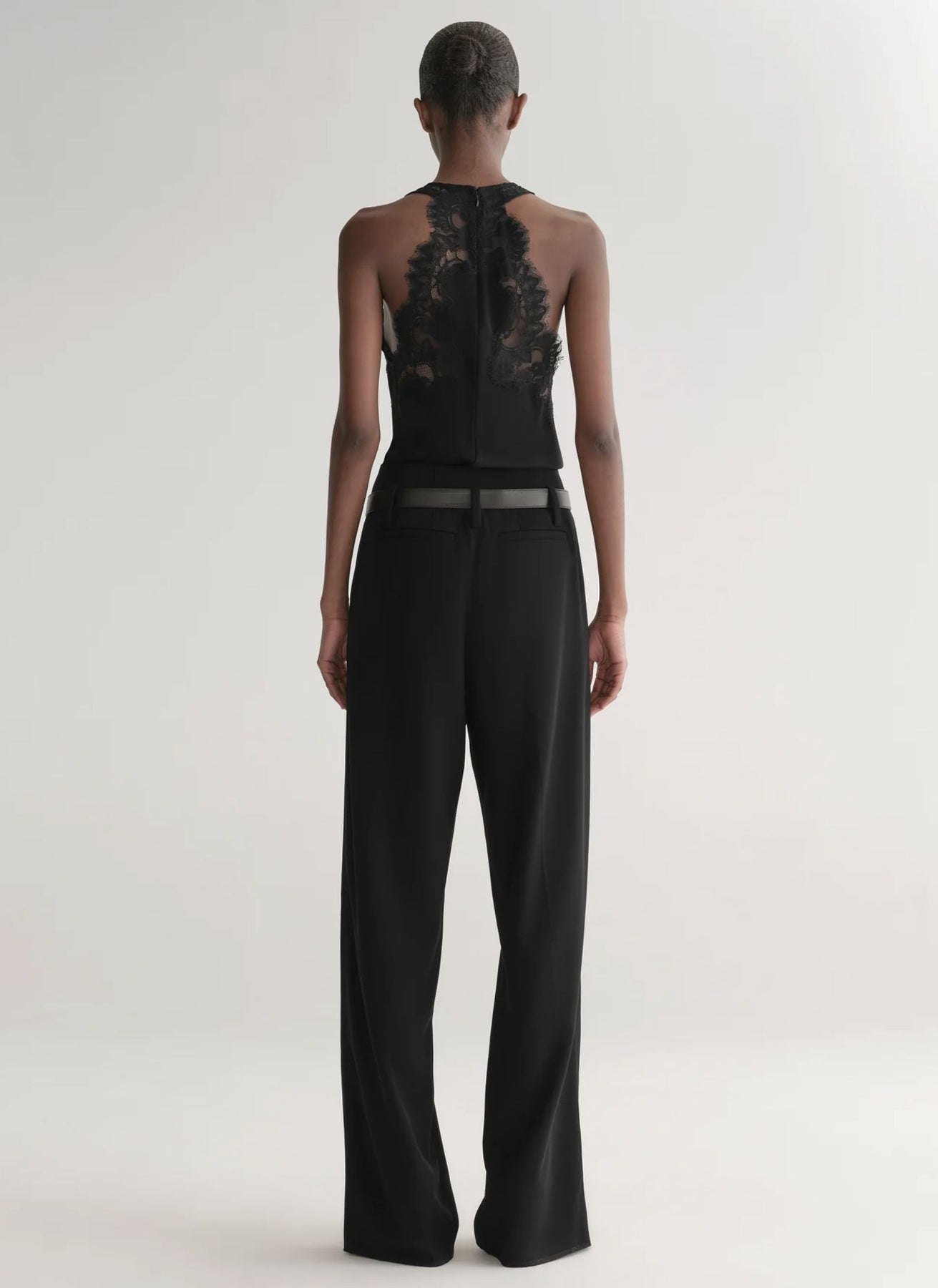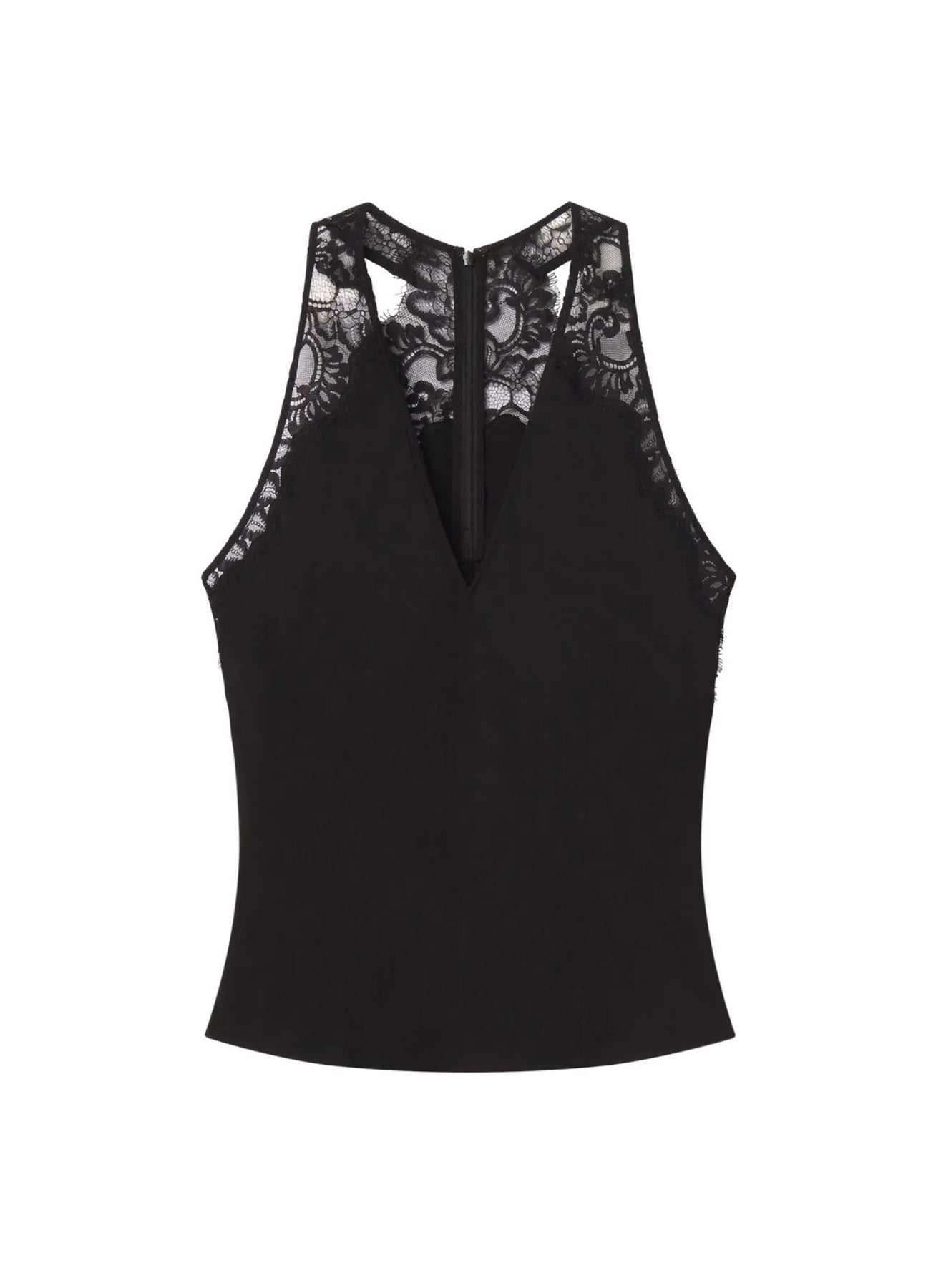 The Wes Top is your new evening essential. An elevated take on the sleeveless blouse, it features French heritage lace panels at the shoulders that bloom into a striking lace back. Cut from crepe-back satin, the V-neck silhouette drapes beautifully for a polished, fluid look. Finished with an invisible back zipper, it’s perfect for layering under blazers or styling alone for evening events—versatile, refined, and holiday-ready.