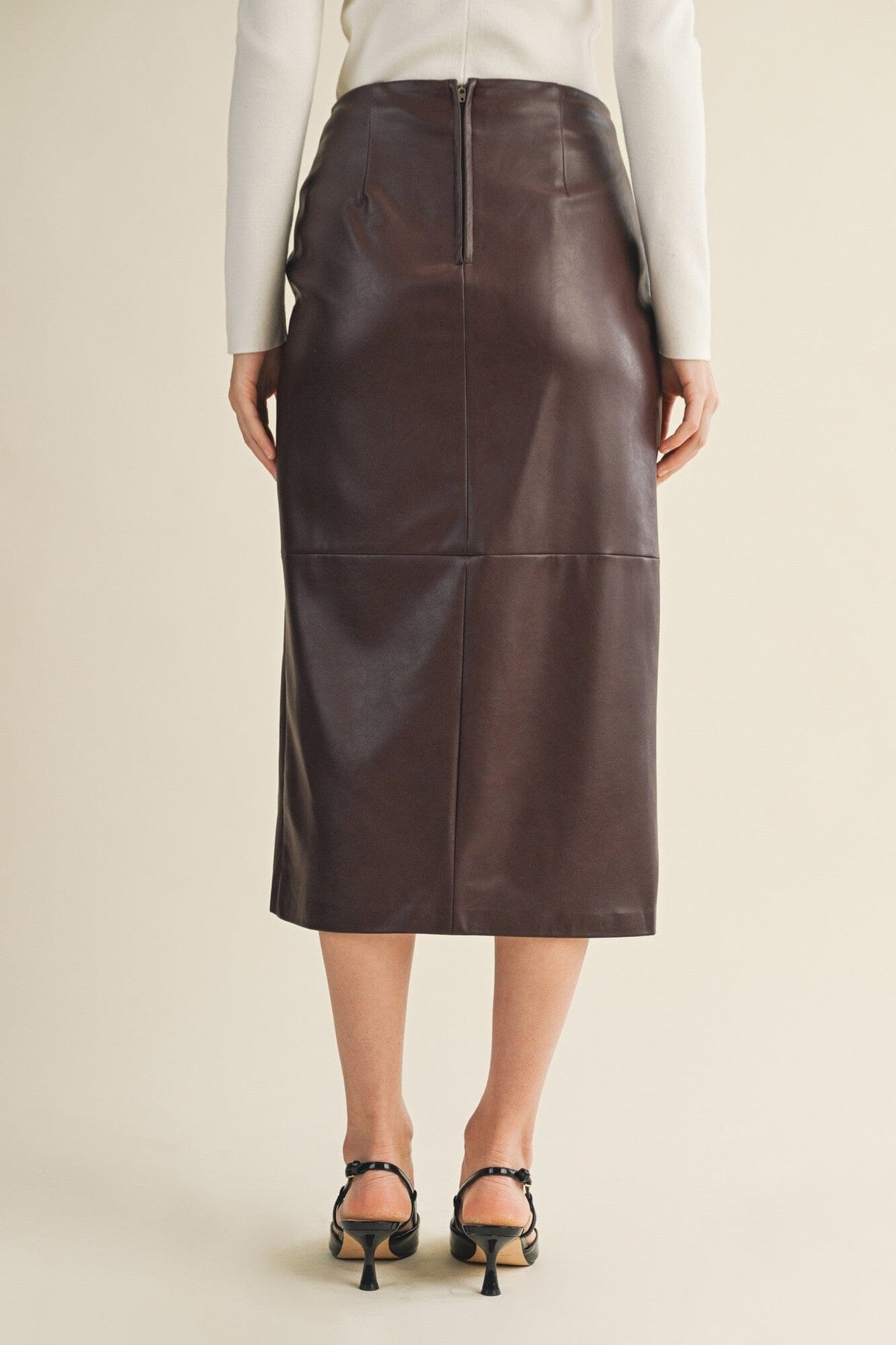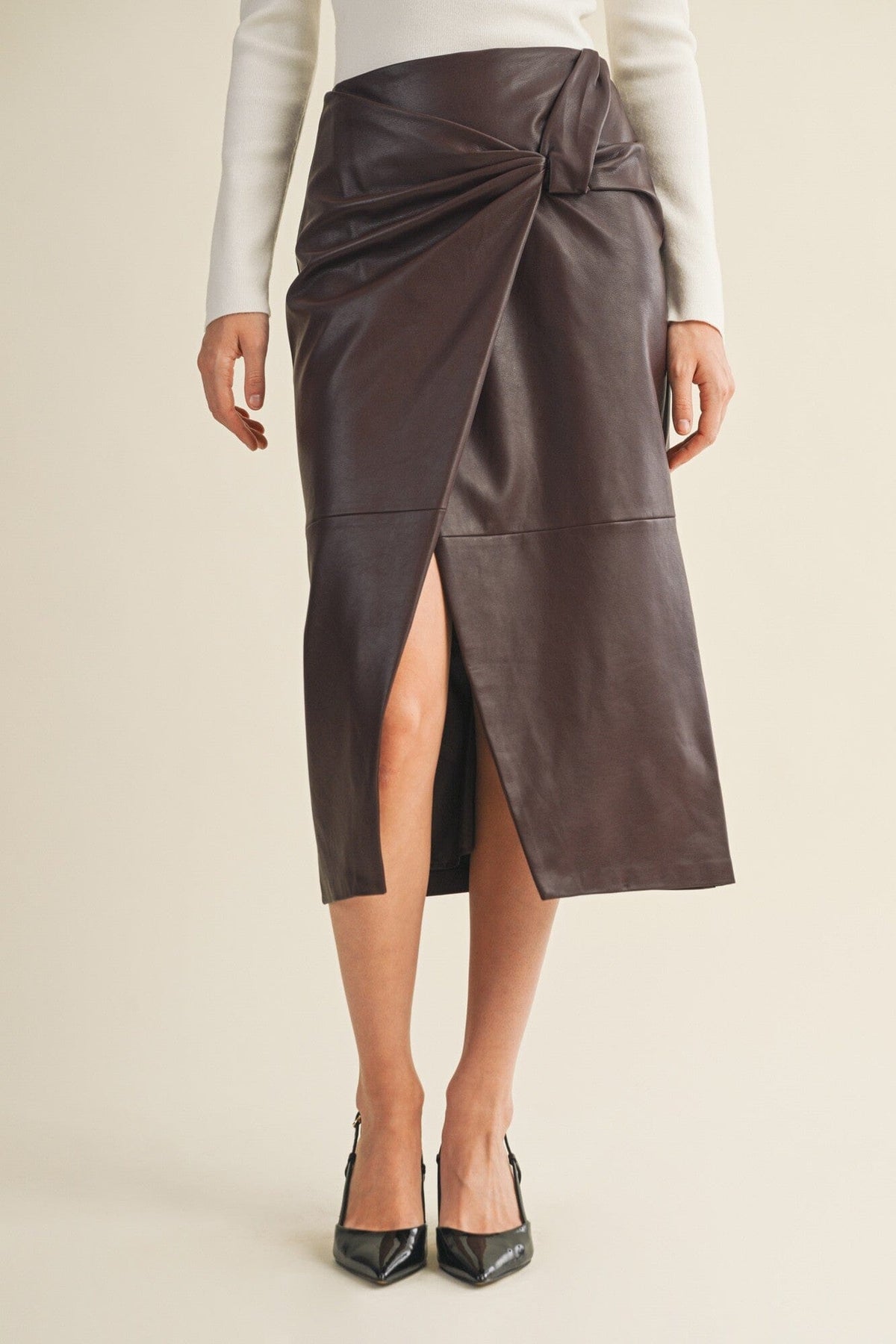Step out in style with the Addison Knot Wrap Skirt, a chic vegan leather piece that pairs effortlessly with a breezy blouse or a cozy chunky sweater. Its wrap design adds a playful twist to your outfit, making it perfect for both workdays and weekend adventures. Embrace comfort and cruelty-free fashion with this versatile skirt that turns heads wherever you go.