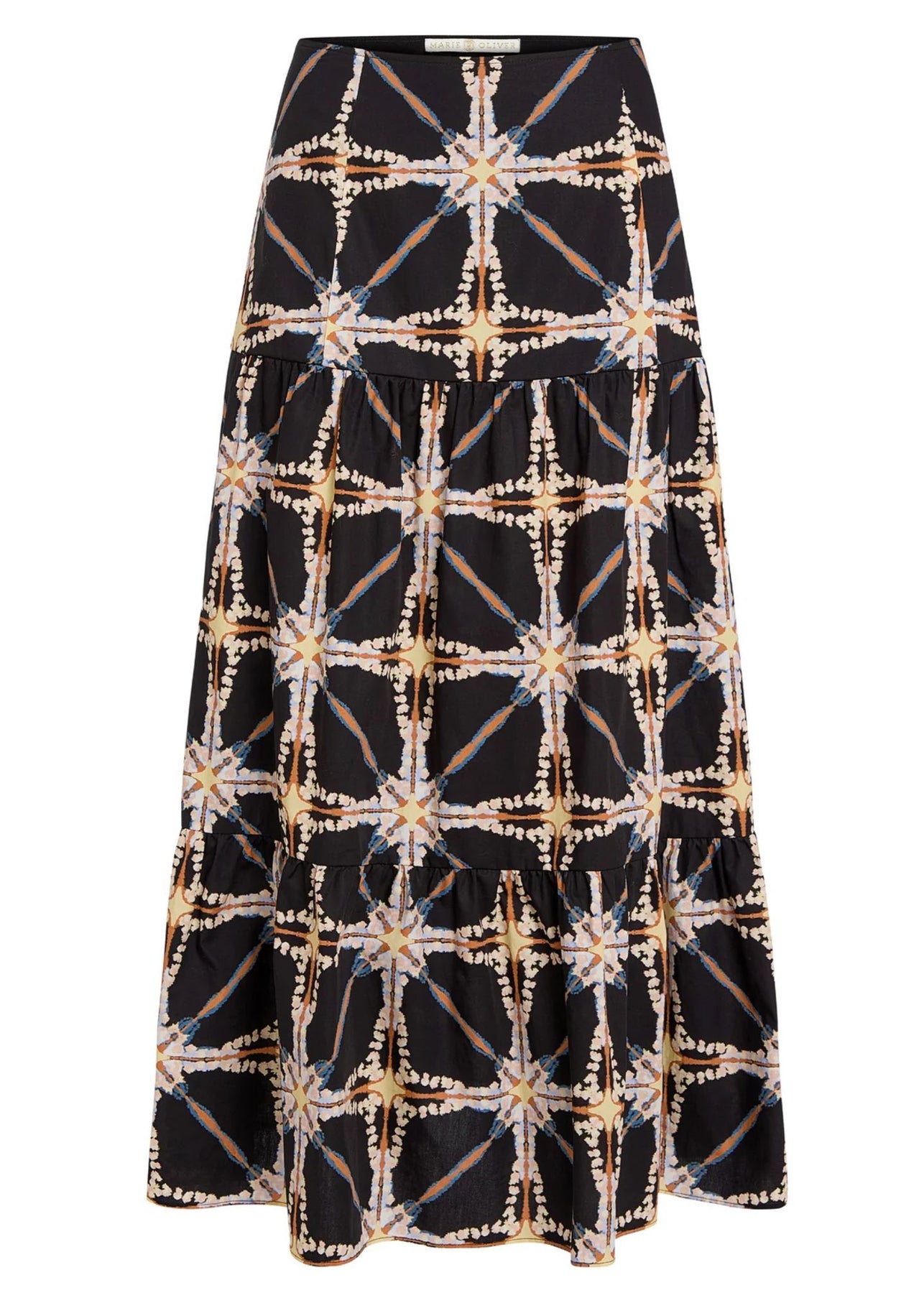 A tiered printed maxi skirt like our new Hines silhouette is a Marie Oliver staple, no matter the season. Shown here in Polaris—a fashion-forward take on tie-dye in a neutral winter palette—Hines brings ease and elegance to year-round dressing.
