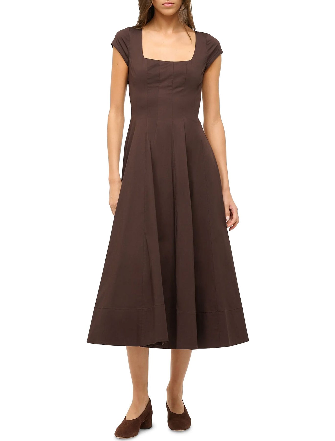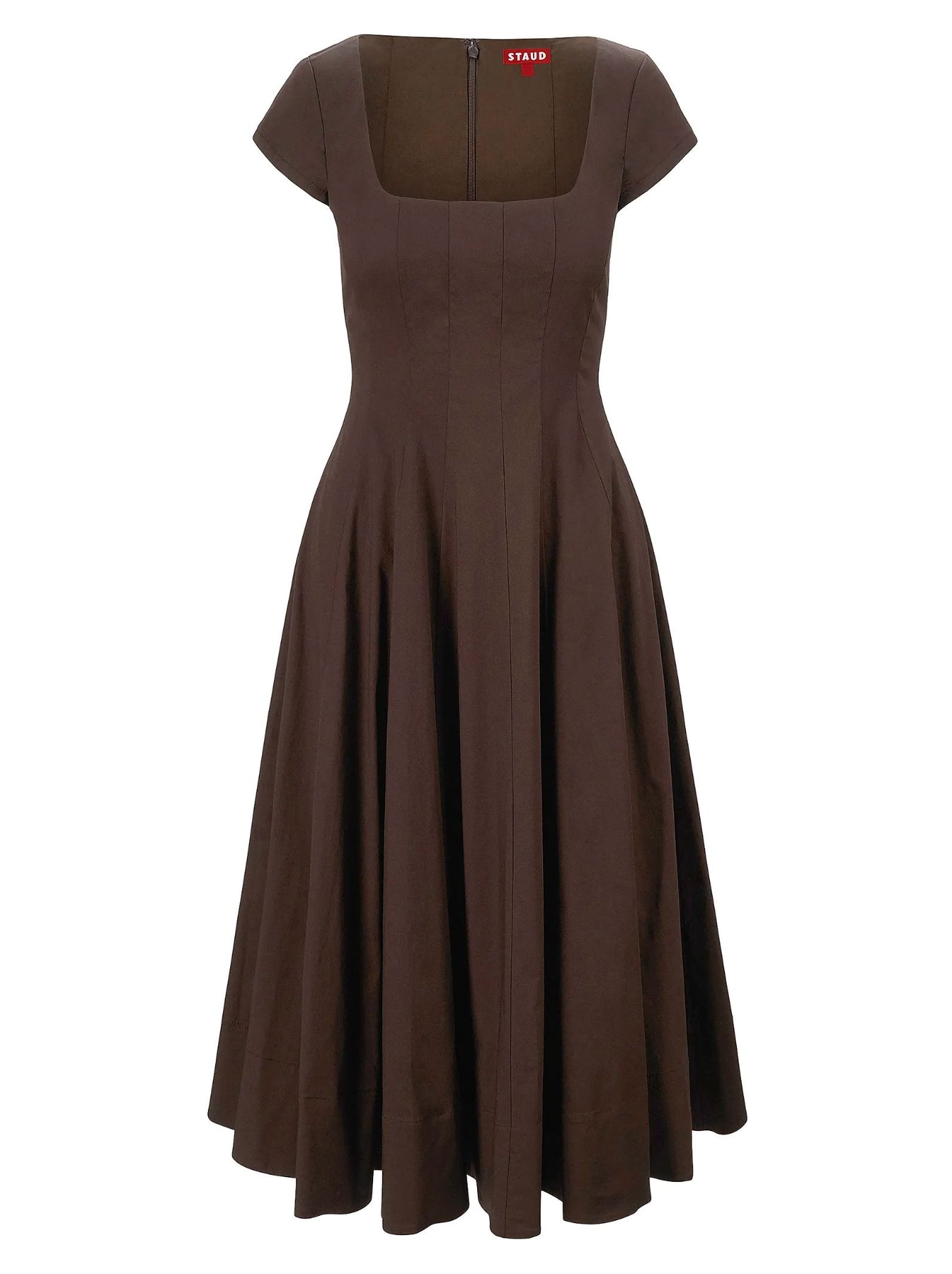 Crafted of stretch cotton, this Staud Wells fit-and-flare midi-dress is styled with a square neck, short sleeves, and back zip closure.