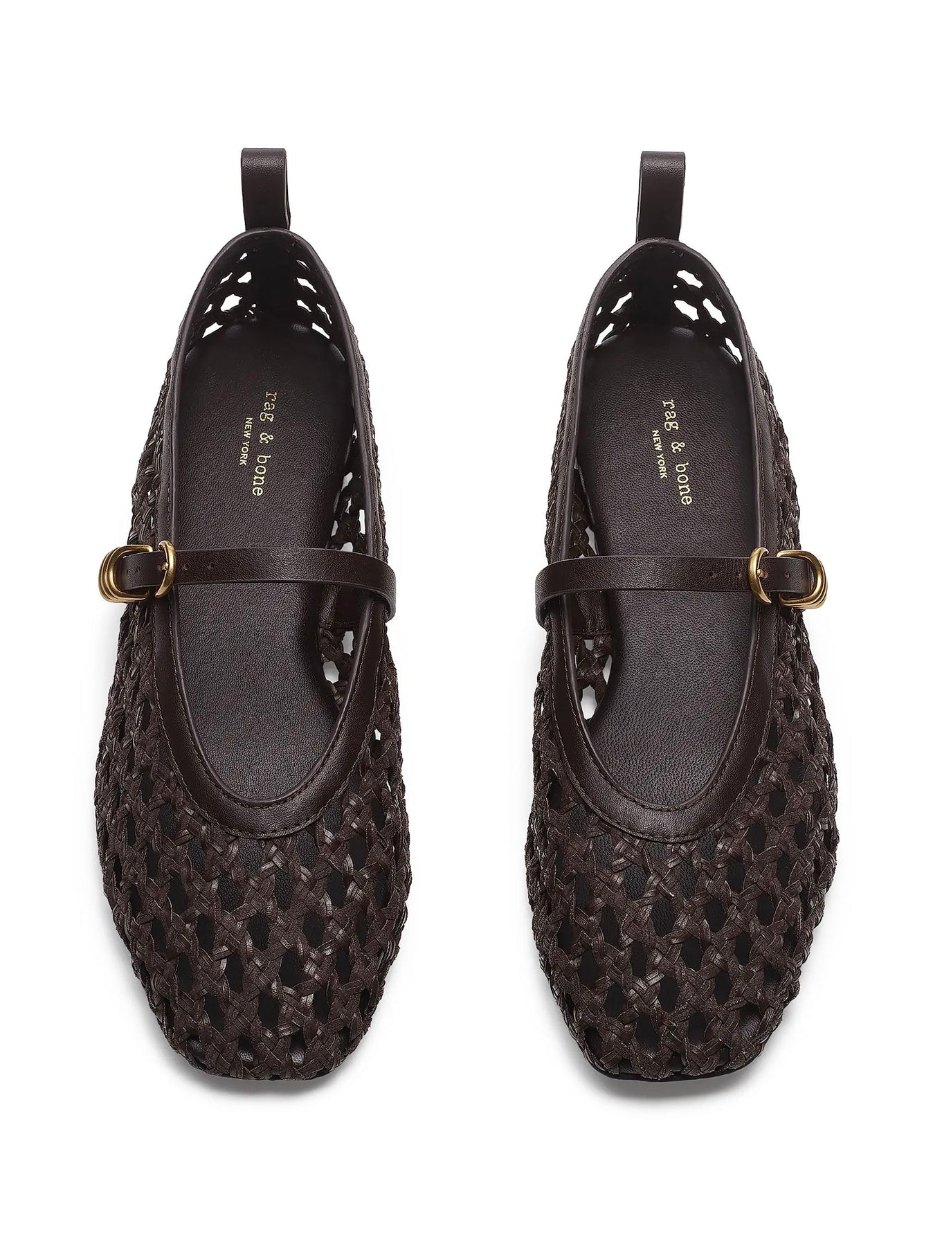 These rag & bone Spire Mary Jane flats are crafted of a dark brown woven material and styled with an adjustable strap.