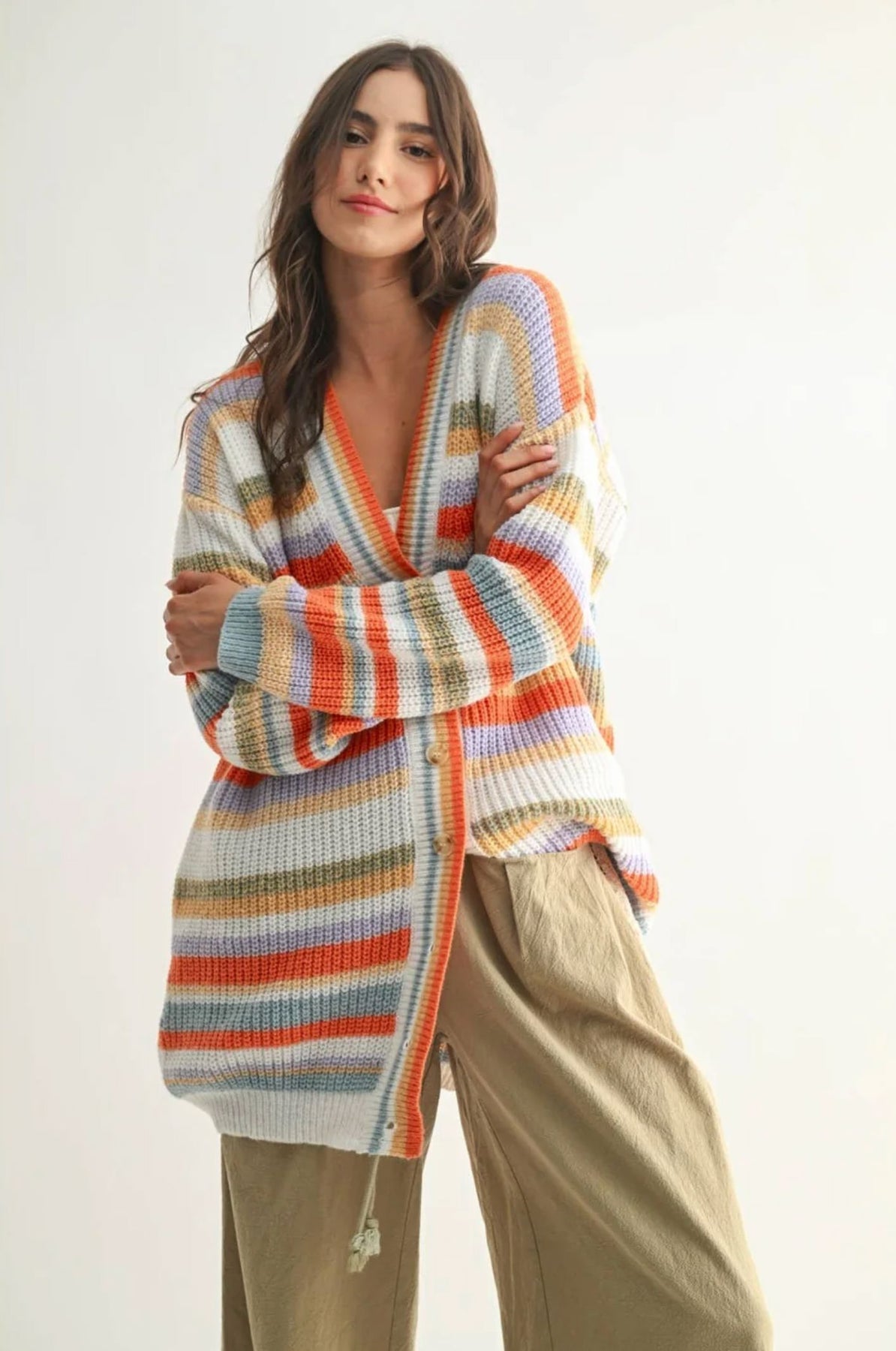 Wrap yourself in the Margie Cardigan—a gloriously oversized knit that's basically a wearable hug. This cozy layer flaunts a vibrant pop of orange and blue that'll brighten any outfit and your mood. Perfect for lounging, layering, or looking effortlessly put-together, it's the cardigan that does it all with style and comfort.